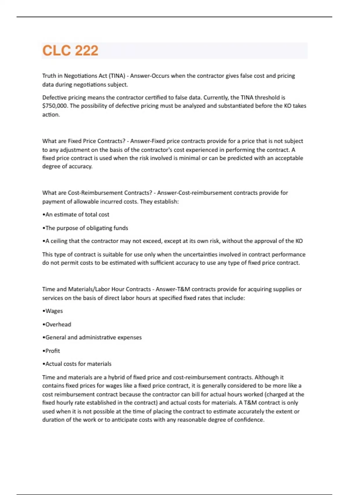 Truth in Negotiations Act (TINA) - Answer-Occurs when the contractor gives false cost and pricing data during negotiations subject. Defective pricing means the contractor certified to false data. Currently, the TINA threshold is $750,000. The possibility of defective pricing must be analyzed and substantiated before the KO takes action. What are Fixed Price Contracts? - Answer-Fixed price contracts provide for a price that is not subject to any adjustment on the basis of the contractor's cost experienced in performing the contract. A fixed price contract is used when the risk involved is minimal or can be predicted with an acceptable degree of accuracy. What are Cost-Reimbursement Contracts? - Answer-Cost-reimbursement contracts provide for payment of allowable incurred costs. They establish: •An estimate of total cost •The purpose of obligating funds •A ceiling that the contractor may not exceed, except at its own risk, without the approval of the KO This type of contract is suitable for use only when the uncertainties involved in contract performance do not permit costs to be estimated with sufficient accuracy to use any type of fixed price contract. Time and Materials/Labor Hour Contracts - Answer-T&M contracts provide for acquiring supplies or services on the basis of direct labor hours at specified fixed rates that include: •Wages •Overhead •General and administrative expenses •Profit •Actual costs for materials Time and materials are a hybrid of fixed price and cost-reimbursement contracts. Although it contains fixed prices for wages like a fixed price contract, it is generally considered to be more like a cost reimbursement contract because the contractor can bill for actual hours worked (charged at the fixed hourly rate established in the contract) and actual costs for materials. A T&M contract is only used when it is not possible at the time of placing the contract to estimate accurately the extent or duration of the work or to anticipate costs with any reasonable degree of confidence.Indefinite Delivery/Indefinite Quantity Contracts - Answer-IDIQ contracts are used to acquire supplies and/or services when the exact time of future deliveries are unknown at the time of contract award. An IDIQ contract provides for an indefinite quantity, within stated limits, of supplies or services to be furnished during a fixed period, with deliveries or performance to be scheduled by placing orders with the contractor.