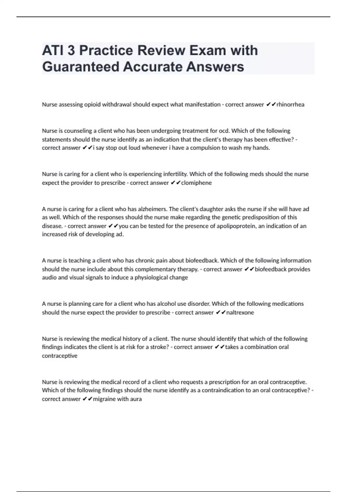 Nurse assessing opioid withdrawal should expect what manifestation - correct answer rhinorrhea Nurse is counseling a client who has been undergoing treatment for ocd. Which of the following statements should the nurse identify as an indication that the client's therapy has been effective? - correct answer i say stop out loud whenever i have a compulsion to wash my hands. Nurse is caring for a client who is experiencing infertility. Which of the following meds should the nurse expect the provider to prescribe - correct answer clomiphene A nurse is caring for a client who has alzheimers. The client's daughter asks the nurse if she will have ad as well. Which of the responses should the nurse make regarding the genetic predisposition of this disease. - correct answer you can be tested for the presence of apolipoprotein, an indication of an increased risk of developing ad. A nurse is teaching a client who has chronic pain about biofeedback. Which of the following information should the nurse include about this complementary therapy. - correct answer biofeedback provides audio and visual signals to induce a physiological change A nurse is planning care for a client who has alcohol use disorder. Which of the following medications should the nurse expect the provider to prescribe - correct answer naltrexone Nurse is reviewing the medical history of a client. The nurse should identify that which of the following findings indicates the client is at risk for a stroke? - correct answer takes a combination oral contraceptive Nurse is reviewing the medical record of a client who requests a prescription for an oral contraceptive. Which of the following findings should the nurse identify as a contraindication to an oral contraceptive? - correct answer migraine with aura Nurse is teaching about acute glomerulonephritis. Which of the following info should the nurse include - correct answer restrict fluid intake based on previous day's urine output Nurse is assessing a 2 year old toddler at a well visit. For which of the following findings shuld the nurse refer the toddler for an evaluation for autism spectrum disorder - correct answer reluctance to make eye contact Nurse is teaching a client who has a new diagnosis of pelvic inflammatory disease and is starting oral antibiotic therapy. Which of the following information should the nurse include in the teaching? - correct answer avoid sexual activity until antibiotic therapy is complete. Nurse is providing discharge teaching to the parent of a school-age child who has a severe bee allergy and a new prescription for an epinephrine auti-injector. Which of the following instructions should the nurse include in the teaching? - correct answer give a second injection if the first fails to entirely reverse your child's reaction