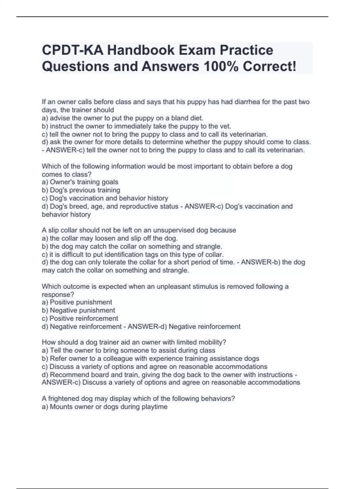 If an owner calls before class and says that his puppy has had diarrhea for the past two days, the trainer should a) advise the owner to put the puppy on a bland diet. b) instruct the owner to immediately take the puppy to the vet. c) tell the owner not to bring the puppy to class and to call its veterinarian. d) ask the owner for more details to determine whether the puppy should come to class. - ANSWER-c) tell the owner not to bring the puppy to class and to call its veterinarian. Which of the following information would be most important to obtain before a dog comes to class? a) Owner's training goals b) Dog's previous training c) Dog's vaccination and behavior history d) Dog's breed, age, and reproductive status - ANSWER-c) Dog's vaccination and behavior history A slip collar should not be left on an unsupervised dog because a) the collar may loosen and slip off the dog. b) the dog may catch the collar on something and strangle. c) it is difficult to put identification tags on this type of collar. d) the dog can only tolerate the collar for a short period of time. - ANSWER-b) the dog may catch the collar on something and strangle. Which outcome is expected when an unpleasant stimulus is removed following a response? a) Positive punishment b) Negative punishment c) Positive reinforcement d) Negative reinforcement - ANSWER-d) Negative reinforcement How should a dog trainer aid an owner with limited mobility? a) Tell the owner to bring someone to assist during class b) Refer owner to a colleague with experience training assistance dogs c) Discuss a variety of options and agree on reasonable accommodations d) Recommend board and train, giving the dog back to the owner with instructions - ANSWER-c) Discuss a variety of options and agree on reasonable accommodations A frightened dog may display which of the following behaviors? a) Mounts owner or dogs during playtime b) Instigates "keep away" with other dogs c) Wags tail with ears set neutrally on head d) Scans facility and does not focus on owner - ANSWER-d) Scans facility and does not focus on owner Which of the following is the most appropriate type of equipment for a dog with a c