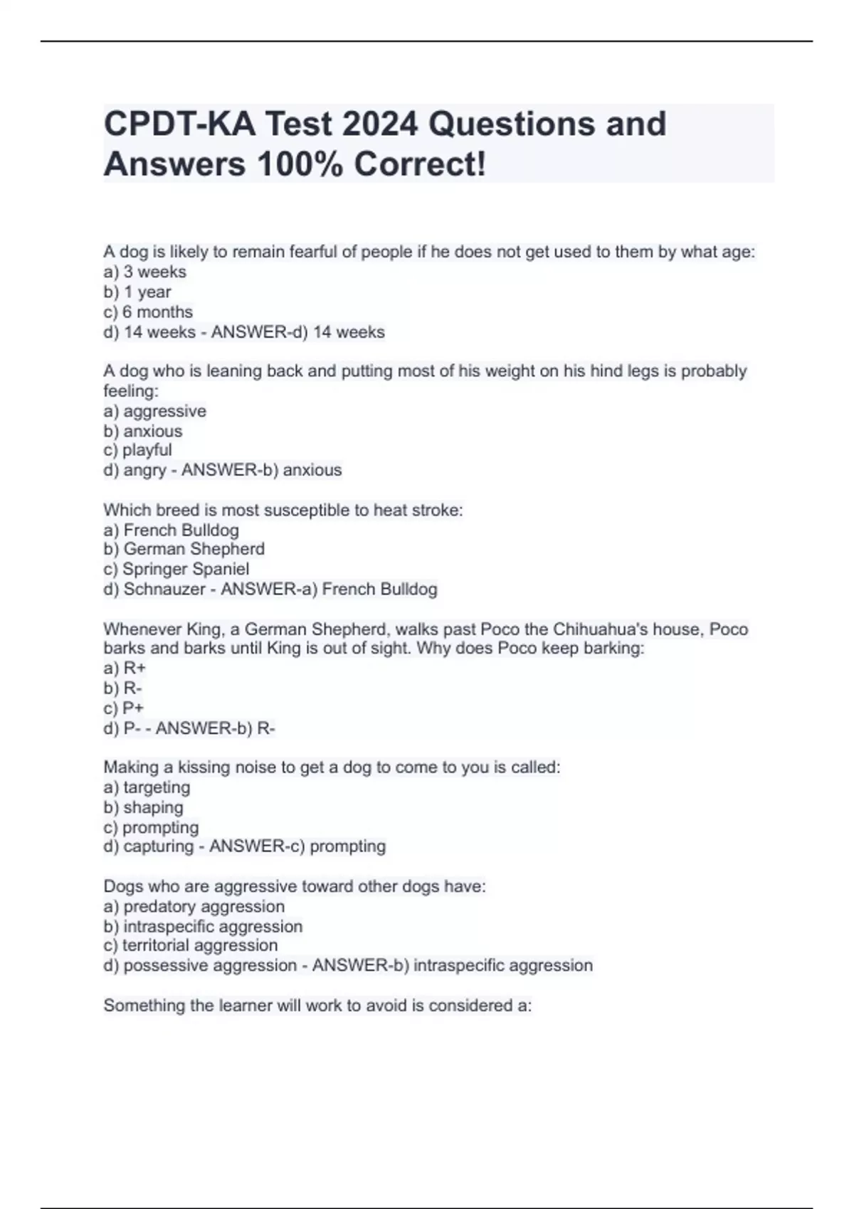 A dog is likely to remain fearful of people if he does not get used to them by what age: a) 3 weeks b) 1 year c) 6 months d) 14 weeks - ANSWER-d) 14 weeks A dog who is leaning back and putting most of his weight on his hind legs is probably feeling: a) aggressive b) anxious c) playful d) angry - ANSWER-b) anxious Which breed is most susceptible to heat stroke: a) French Bulldog b) German Shepherd c) Springer Spaniel d) Schnauzer - ANSWER-a) French Bulldog Whenever King, a German Shepherd, walks past Poco the Chihuahua's house, Poco barks and barks until King is out of sight. Why does Poco keep barking: a) R+ b) R- c) P+ d) P- - ANSWER-b) R- Making a kissing noise to get a dog to come to you is called: a) targeting b) shaping c) prompting d) capturing - ANSWER-c) prompting Dogs who are aggressive toward other dogs have: a) predatory aggression b) intraspecific aggression c) territorial aggression d) possessive aggression - ANSWER-b) intraspecific aggression Something the learner will work to avoid is considered a: a) reinforcer b) prong collar c) secondary reinforcer d) punisher - ANSWER-d) punisher Meg's trainer has told her to give her dog a gentle tug on his choke chain whenever he starts to pull on the leash. This is: a) R+