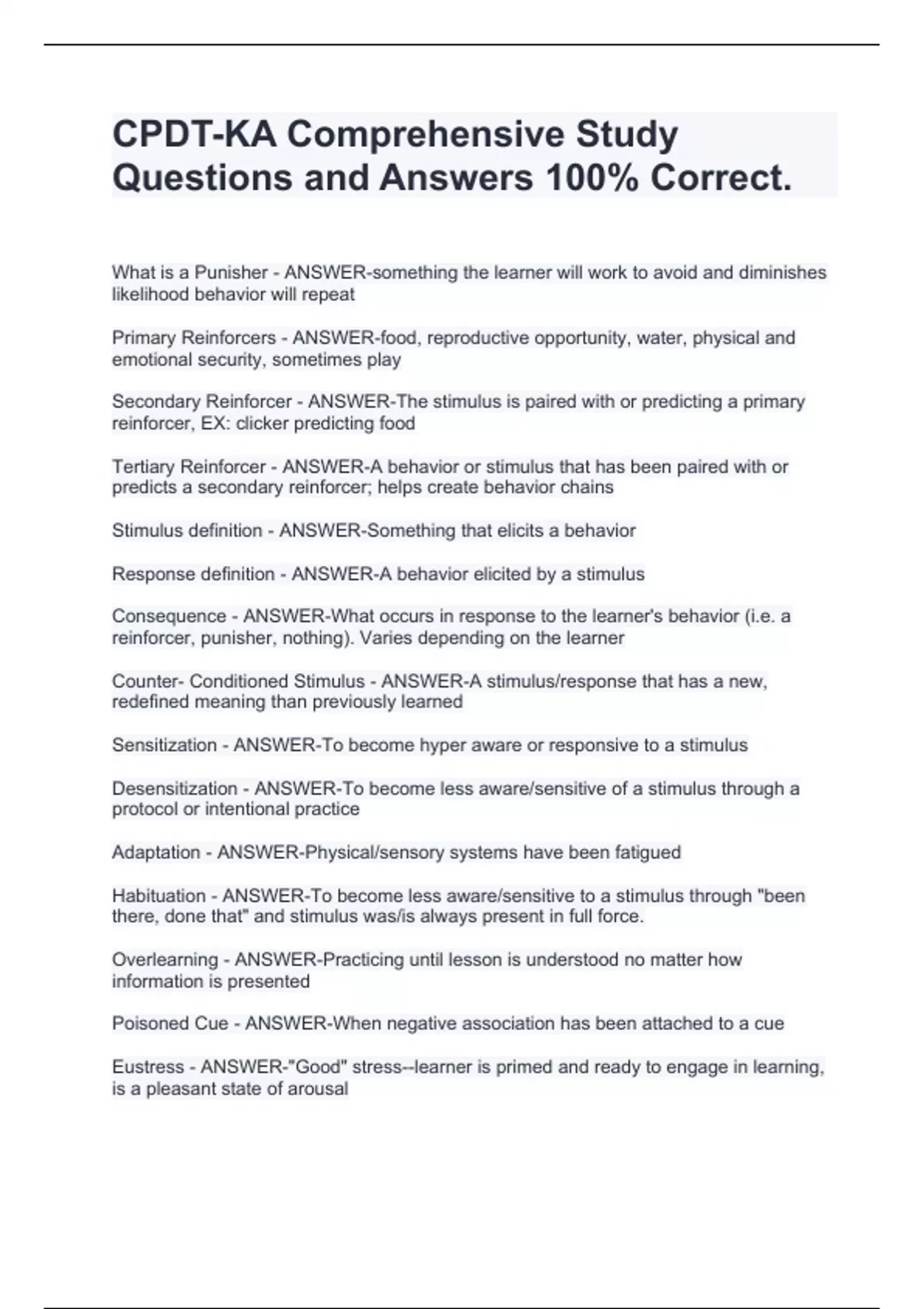 What is a Punisher - ANSWER-something the learner will work to avoid and diminishes likelihood behavior will repeat Primary Reinforcers - ANSWER-food, reproductive opportunity, water, physical and emotional security, sometimes play Secondary Reinforcer - ANSWER-The stimulus is paired with or predicting a primary reinforcer, EX: clicker predicting food Tertiary Reinforcer - ANSWER-A behavior or stimulus that has been paired with or predicts a secondary reinforcer; helps create behavior chains Stimulus definition - ANSWER-Something that elicits a behavior Response definition - ANSWER-A behavior elicited by a stimulus Consequence - ANSWER-What occurs in response to the learner's behavior (i.e. a reinforcer, punisher, nothing). Varies depending on the learner Counter- Conditioned Stimulus - ANSWER-A stimulus/response that has a new, redefined meaning than previously learned Sensitization - ANSWER-To become hyper aware or responsive to a stimulus Desensitization - ANSWER-To become less aware/sensitive of a stimulus through a protocol or intentional practice Adaptation - ANSWER-Physical/sensory systems have been fatigued Habituation - ANSWER-To become less aware/sensitive to a stimulus through "been there, done that" and stimulus was/is always present in full force. Overlearning - ANSWER-Practicing until lesson is understood no matter how information is presented Poisoned Cue - ANSWER-When negative association has been attached to a cue Eustress - ANSWER-"Good" stress--learner is primed and ready to engage in learning, is a pleasant state of arousal Distress - ANSWER-"Bad" stress--learner is overwhelmed and overloaded with stress horm