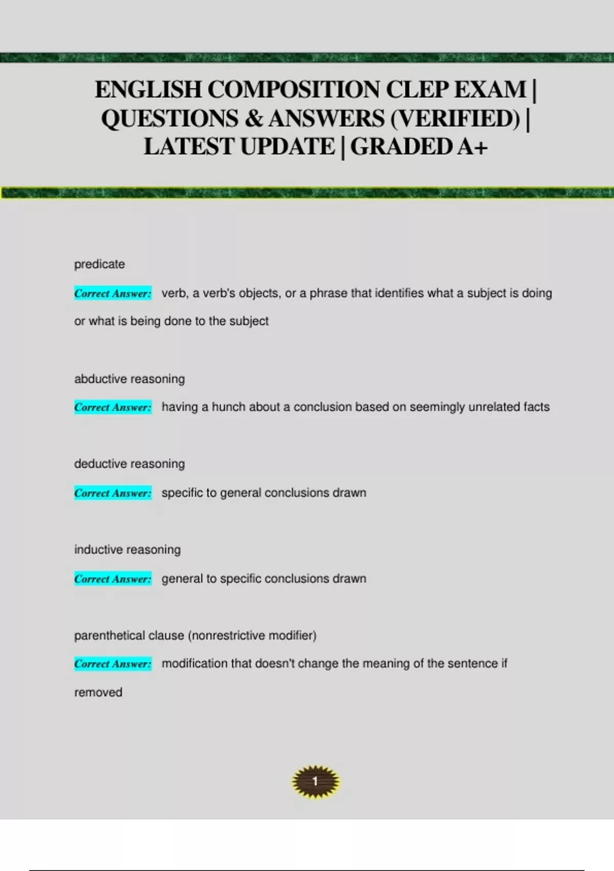 ENGLISH COMPOSITION CLEP EXAM | QUESTIONS & ANSWERS (VERIFIED) | LATEST UPDATE | GRADED A+