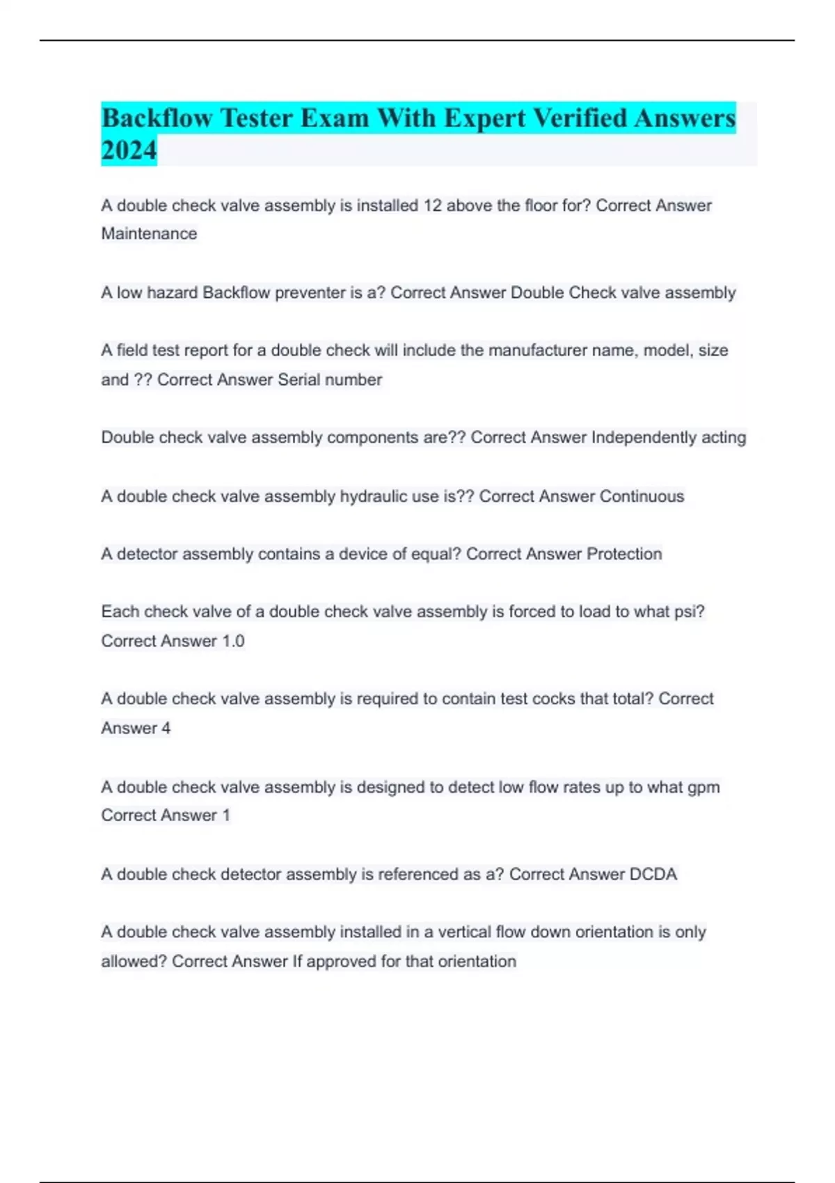 Backflow Tester Exam With Expert Verified Answers 2024 A double check valve assembly is installed 12 above the floor for? Correct Answer Maintenance A low hazard Backflow preventer is a? Correct Answer Double Check valve assembly A field test report for a double check will include the manufacturer name, model, size and ?? Correct Answer Serial number Double check valve assembly components are?? Correct Answer Independently acting A double check valve assembly hydraulic use is?? Correct Answer Continuous A detector assembly contains a device of equal? Correct Answer Protection Each check valve of a double check valve assembly is forced to load to what psi? Correct Answer 1.0 A double check valve assembly is required to contain test cocks that total? Correct Answer 4 A double check valve assembly is designed to detect low flow rates up to what gpm Correct Answer 1 A double check detector assembly is referenced as a? Correct Answer DCDA A double check valve assembly installed in a vertical flow down orientation is only allowed? Correct Answer If approved for that orientation The max height the water will rise in a barometric loop is dependent of? Correct Answer Atmospheric pressure The number 1 check spring on a RP has a minimum spring tension requirement of? Correct Answer 5 psi Relief valves are designed to open to atmosphere when supply pressure becomes less than? Correct Answer 2 psi