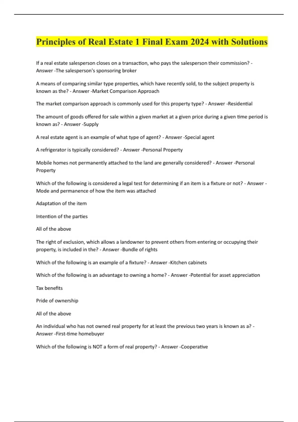Principles of Real Estate 1 Final Exam 2024 with Solutions If a real estate salesperson closes on a transaction, who pays the salesperson their commission? - Answer -The salesperson's sponsoring broker A means of comparing similar type properties, which have recently sold, to the subject property is known as the? - Answer -Market Comparison Approach The market comparison approach is commonly used for this property type? - Answer -Residential The amount of goods offered for sale within a given market at a given price during a given time period is known as? - Answer -Supply A real estate agent is an example of what type of agent? - Answer -Special agent A refrigerator is typically considered? - Answer -Personal Property Mobile homes not permanently attached to the land are generally considered? - Answer -Personal Property Which of the following is considered a legal test for determining if an item is a fixture or not? - Answer - Mode and permanence of how the item was attached Adaptation of the item Intention of the parties All of the above The right of exclusion, which allows a landowner to prevent others from entering or occupying their property, is included in the? - Answer -Bundle of rights Which of the following is an example of a fixture? - Answer -Kitchen cabinets Which of the following is an advantage to owning a home? - Answer -Potential for asset appreciation Tax benefits Pride of ownership All of the above An individual who has not owned real property for at least the previous two years is known as a? - Answer -First-time homebuyer Which of the following is NOT a form of real property?