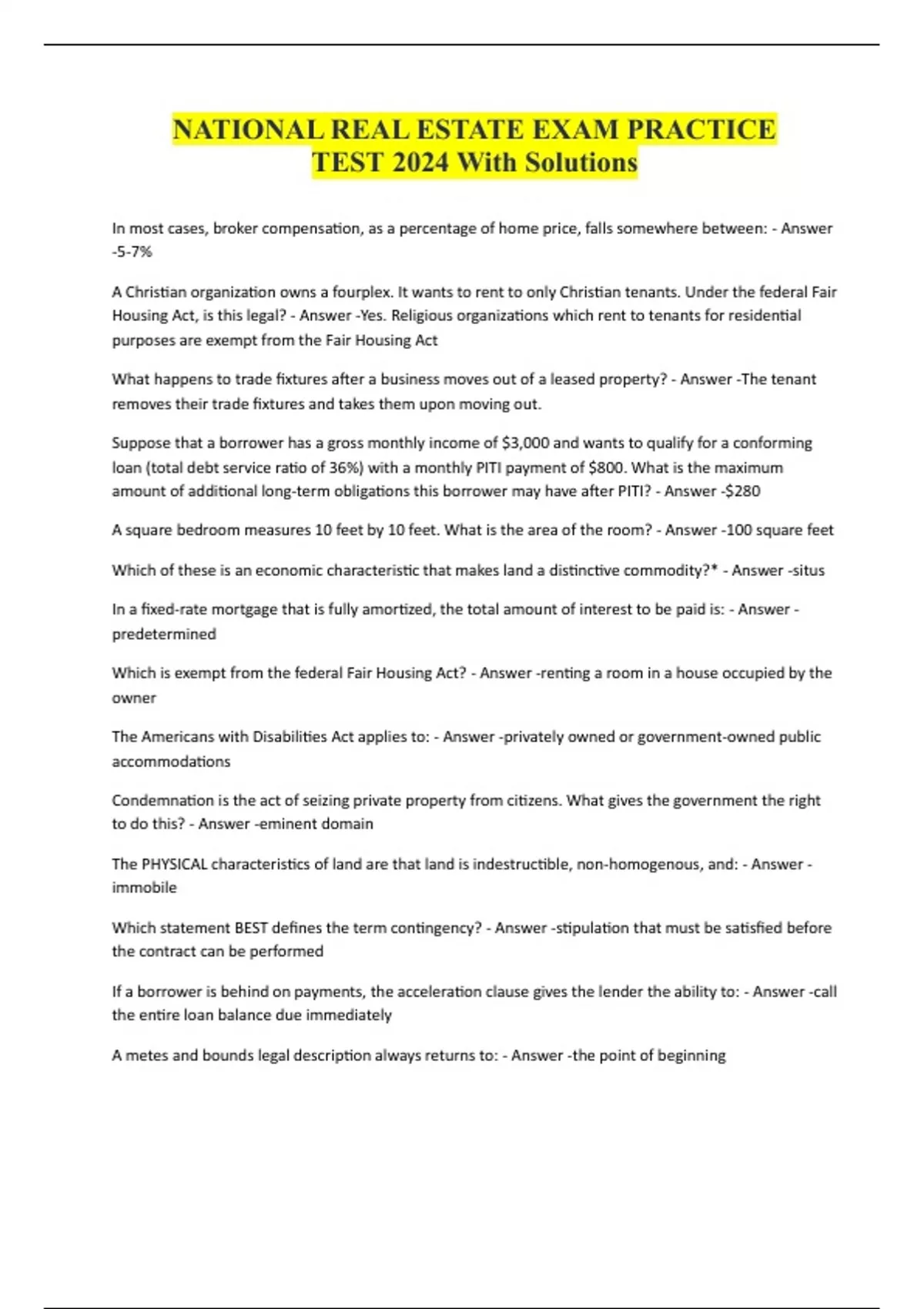 NATIONAL REAL ESTATE EXAM PRACTICE TEST 2024 With Solutions In most cases, broker compensation, as a percentage of home price, falls somewhere between: - Answer -5-7% A Christian organization owns a fourplex. It wants to rent to only Christian tenants. Under the federal Fair Housing Act, is this legal? - Answer -Yes. Religious organizations which rent to tenants for residential purposes are exempt from the Fair Housing Act What happens to trade fixtures after a business moves out of a leased property? - Answer -The tenant removes their trade fixtures and takes them upon moving out. Suppose that a borrower has a gross monthly income of $3,000 and wants to qualify for a conforming loan (total debt service ratio of 36%) with a monthly PITI payment of $800. What is the maximum amount of additional long-term obligations this borrower may have after PITI? - Answer -$280 A square bedroom measures 10 feet by 10 feet. What is the area of the room? - Answer -100 square feet Which of these is an economic characteristic that makes land a distinctive commodity?* - Answer -situs In a fixed-rate mortgage that is fully amortized, the total amount of interest to be paid is: - Answer - predetermined Which is exempt from the federal Fair Housing Act? - Answer -renting a room in a house occupied by the owner The Americans with Disabilities Act applies to: - Answer -privately owned or government-owned public accommodations Condemnation is the act of seizing private property from citizens. What gives the government the right to do this? - Answer -eminent domain The PHYSICAL characteristics of land are that land is indestructible, non-homogenous, and: - Answer - immobile Which statement BEST defines the term contingency? - Answer -stipulation that must be satisfied before the contract can be performed If a borrower is behind on payments, the acceleration clause gives the lender the ability to: - Answer -call the entire loan balance due immediately