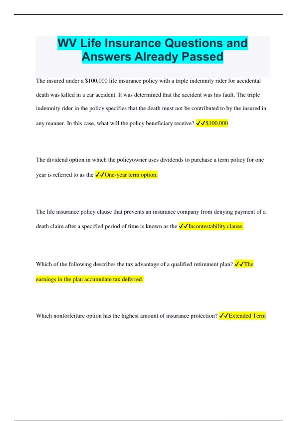 WV Life Insurance Questions and Answers Already Passed