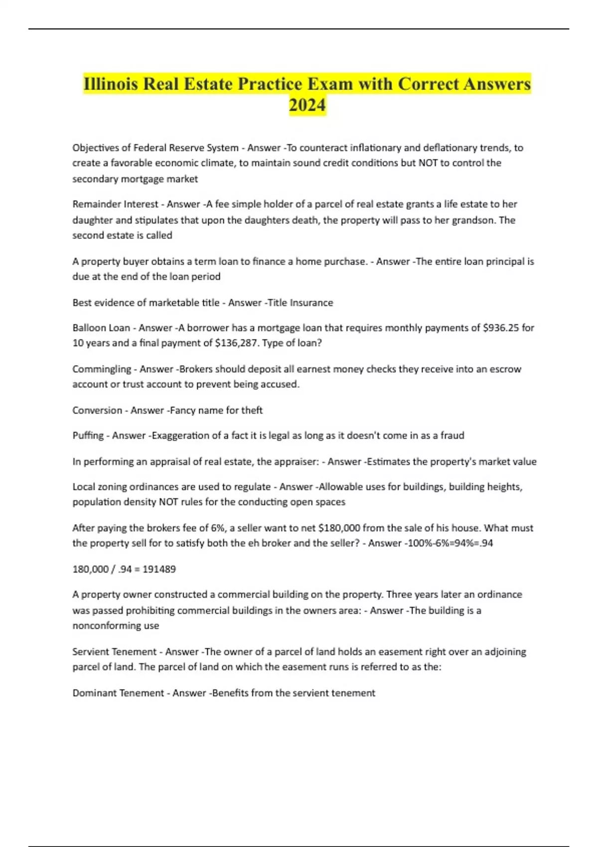 Illinois Real Estate Practice Exam with Correct Answers 2024 Objectives of Federal Reserve System - Answer -To counteract inflationary and deflationary trends, to create a favorable economic climate, to maintain sound credit conditions but NOT to control the secondary mortgage market Remainder Interest - Answer -A fee simple holder of a parcel of real estate grants a life estate to her daughter and stipulates that upon the daughters death, the property will pass to her grandson. The second estate is called A property buyer obtains a term loan to finance a home purchase. - Answer -The entire loan principal is due at the end of the loan period Best evidence of marketable title - Answer -Title Insurance Balloon Loan - Answer -A borrower has a mortgage loan that requires monthly payments of $936.25 for 10 years and a final payment of $136,287. Type of loan? Commingling - Answer -Brokers should deposit all earnest money checks they receive into an escrow account or trust account to prevent being accused. Conversion - Answer -Fancy name for theft Puffing - Answer -Exaggeration of a fact it is legal as long as it doesn't come in as a fraud In performing an appraisal of real estate, the appraiser: - Answer -Estimates the property's market value Local zoning ordinances are used to regulate - Answer -Allowable uses for buildings, building heights, population density NOT rules for the conducting open spaces After paying the brokers fee of 6%, a seller want to net $180,000 from the sale of his house. What must the property sell for to satisfy both the eh broker and the seller? - Answer -100%-6%=94%=.94 180,000 / .94 = 191489 A property owner constructed a commercial building on the property. Three years later an ordinance was passed prohibiting commercial buildings in the owners area: - Answer -The building is a nonconforming use Servient Tenement - Answer -The owner of a parcel of land holds an easement right over an adjoining parcel of land. The parcel of land on which the easement runs is referred to as the: Dominant Tenement - Answer -Benefits from the servient tenement