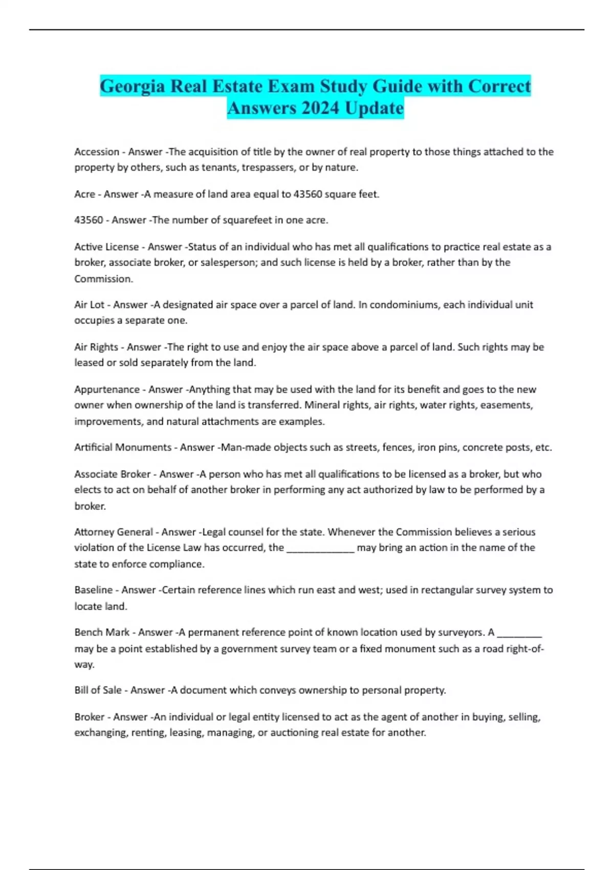 Georgia Real Estate Exam Study Guide with Correct Answers 2024 Update Accession - Answer -The acquisition of title by the owner of real property to those things attached to the property by others, such as tenants, trespassers, or by nature. Acre - Answer -A measure of land area equal to 43560 square feet. 43560 - Answer -The number of squarefeet in one acre. Active License - Answer -Status of an individual who has met all qualifications to practice real estate as a broker, associate broker, or salesperson; and such license is held by a broker, rather than by the Commission. Air Lot - Answer -A designated air space over a parcel of land. In condominiums, each individual unit occupies a separate one. Air Rights - Answer -The right to use and enjoy the air space above a parcel of land. Such rights may be leased or sold separately from the land. Appurtenance - Answer -Anything that may be used with the land for its benefit and goes to the new owner when ownership of the land is transferred. Mineral rights, air rights, water rights, easements, improvements, and natural attachments are examples. Artificial Monuments - Answer -Man-made objects such as streets, fences, iron pins, concrete posts, etc. Associate Broker - Answer -A person who has met all qualifications to be licensed as a broker, but who elects to act on behalf of another broker in performing any act authorized by law to be performed by a broker. Attorney General - Answer -Legal counsel for the state. Whenever the Commission believes a serious violation of the License Law has occurred, the ____________ may bring an action in the name of the state to enforce compliance. Baseline - Answer -Certain reference lines which run east and west; used in rectangular survey system to locate land. Bench Mark - Answer -A permanent reference point of known location used by surveyors. A ________ may be a point established by a government survey team or a fixed monument such as a road right-ofway. Bill of Sale - Answer -A document which conveys ownership to personal property. Broker - Answer -An individual or legal entity licensed to act as the agent of another in buying, selling, exchanging, renting, leasing, managing, or auctioning real estate for another.Call - Answer -The compass direction and distance for each boundary line. Censure - Answer -Disciplinary power of the Commission whereby it reprimands a license