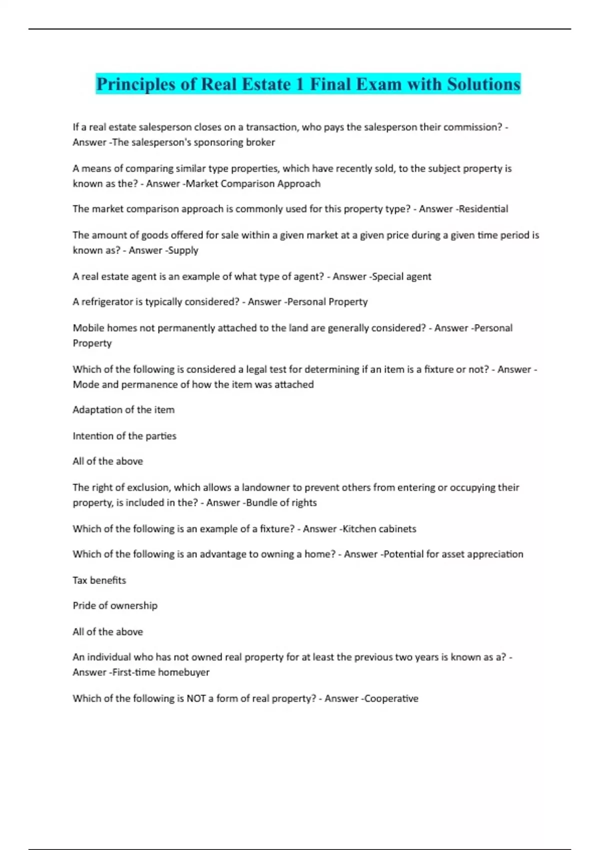 Principles of Real Estate 1 Final Exam with Solutions If a real estate salesperson closes on a transaction, who pays the salesperson their commission? - Answer -The salesperson's sponsoring broker A means of comparing similar type properties, which have recently sold, to the subject property is known as the? - Answer -Market Comparison Approach The market comparison approach is commonly used for this property type? - Answer -Residential The amount of goods offered for sale within a given market at a given price during a given time period is known as? - Answer -Supply A real estate agent is an example of what type of agent? - Answer -Special agent A refrigerator is typically considered? - Answer -Personal Property Mobile homes not permanently attached to the land are generally considered? - Answer -Personal Property Which of the following is considered a legal test for determining if an item is a fixture or not? - Answer - Mode and permanence of how the item was attached Adaptation of the item Intention of the parties All of the above The right of exclusion, which allows a landowner to prevent others from entering or occupying their property, is included in the? - Answer -Bundle of rights Which of the following is an example of a fixture? - Answer -Kitchen cabinets Which of the following is an advantage to owning a home? - Answer -Potential for asset appreciation Tax benefits Pride of ownership All of the above An individual who has not owned real property for at least the previous two years is known as a? - Answer -First-time homebuyer Which of the following is NOT a form of real property? - Answer -Coop