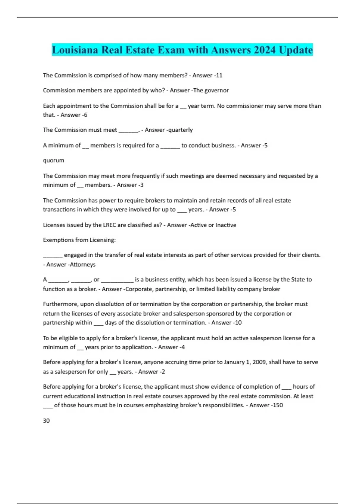 Louisiana Real Estate Exam with Answers 2024 Update The Commission is comprised of how many members? - Answer -11 Commission members are appointed by who? - Answer -The governor Each appointment to the Commission shall be for a __ year term. No commissioner may serve more than that. - Answer -6 The Commission must meet ______. - Answer -quarterly A minimum of __ members is required for a ______ to conduct business. - Answer -5 quorum The Commission may meet more frequently if such meetings are deemed necessary and requested by a minimum of __ members. - Answer -3 The Commission has power to require brokers to maintain and retain records of all real estate transactions in which they were involved for up to ___ years. - Answer -5 Licenses issued by the LREC are classified as? - Answer -Active or Inactive Exemptions from Licensing: ______ engaged in the transfer of real estate interests as part of other services provided for their clients. - Answer -Attorneys A ______, ______, or __________ is a business entity, which has been issued a license by the State to function as a broker. - Answer -Corporate, partnership, or limited liability company broker Furthermore, upon dissolution of or termination by the corporation or partnership, the broker must return the licenses of every associate broker and salesperson sponsored by the corporation or partnership within ___ days of the dissolution or termination. - Answer -10 To be eligible to apply for a broker's license, the applicant must hold an active salesperson license