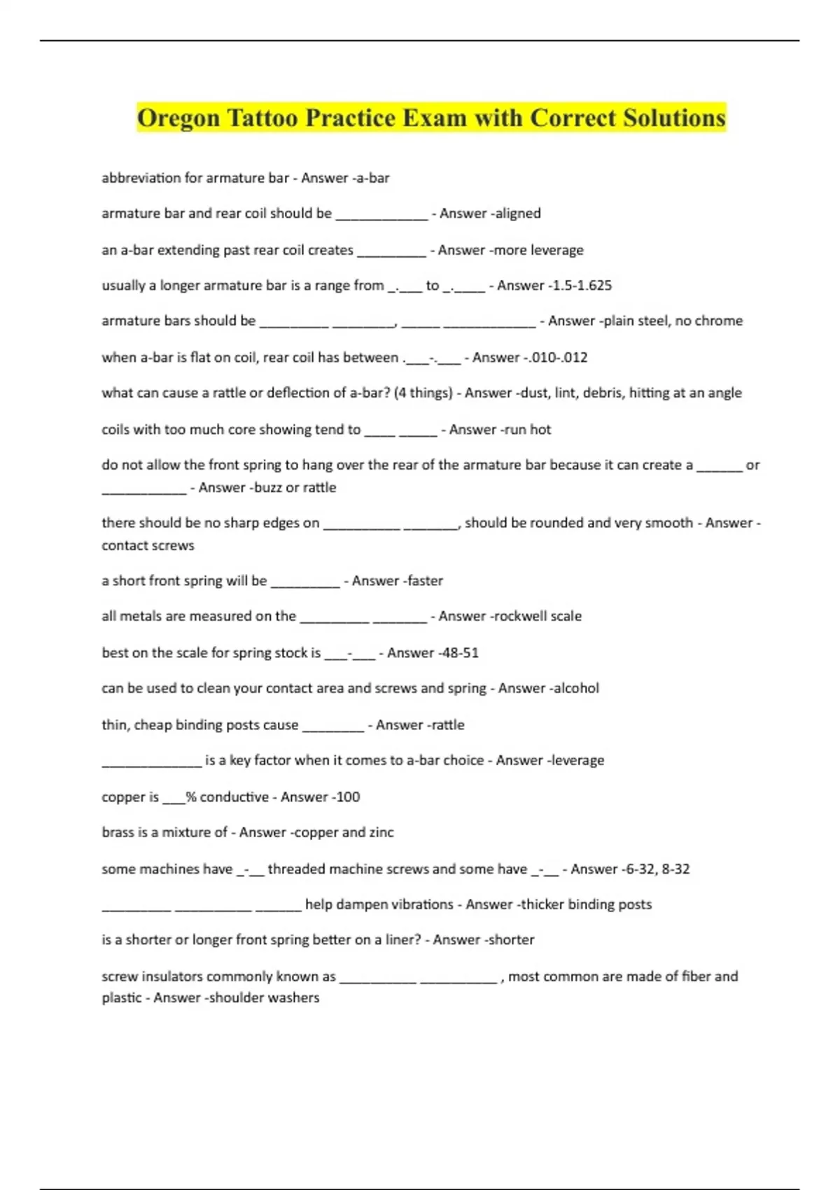 Oregon Tattoo Practice Exam with Correct Solutions abbreviation for armature bar - Answer -a-bar armature bar and rear coil should be ____________ - Answer -aligned an a-bar extending past rear coil creates _________ - Answer -more leverage usually a longer armature bar is a range from _.___ to _.____ - Answer -1.5-1.625 armature bars should be _________ ________, _____ ____________ - Answer -plain steel, no chrome when a-bar is flat on coil, rear coil has between .___-.___ - Answer -.010-.012 what can cause a rattle or deflection of a-bar? (4 things) - Answer -dust, lint, debris, hitting at an angle coils with too much core showing tend to ____ _____ - Answer -run hot do not allow the front spring to hang over the rear of the armature bar because it can create a ______ or ___________ - Answer -buzz or rattle there should be no sharp edges on __________ _______, should be rounded and very smooth - Answer - contact screws a short front spring will be _________ - Answer -faster all metals are measured on the _________ _______ - Answer -rockwell scale best on the scale for spring stock is ___-___ - Answer -48-51 can be used to clean your contact area and screws and spring - Answer -alcohol thin, cheap binding posts cause ________ - Answer -rattle _____________ is a key factor when it comes to a-bar choice - Answer -leverage copper is ___% conductive - Answer -100 brass is a mixture of - Answer -copper and zinc some machines have _-__ threaded machine screws and some have _-__ - Answer -6-32, 8-32 _________ __________ ______ help dampen vibrations - Answer -thicker binding posts is a shorter or longer front spring better on a liner? - Answer -shorter screw insulators commonly known as __________ __________ , most common are made of fiber and p