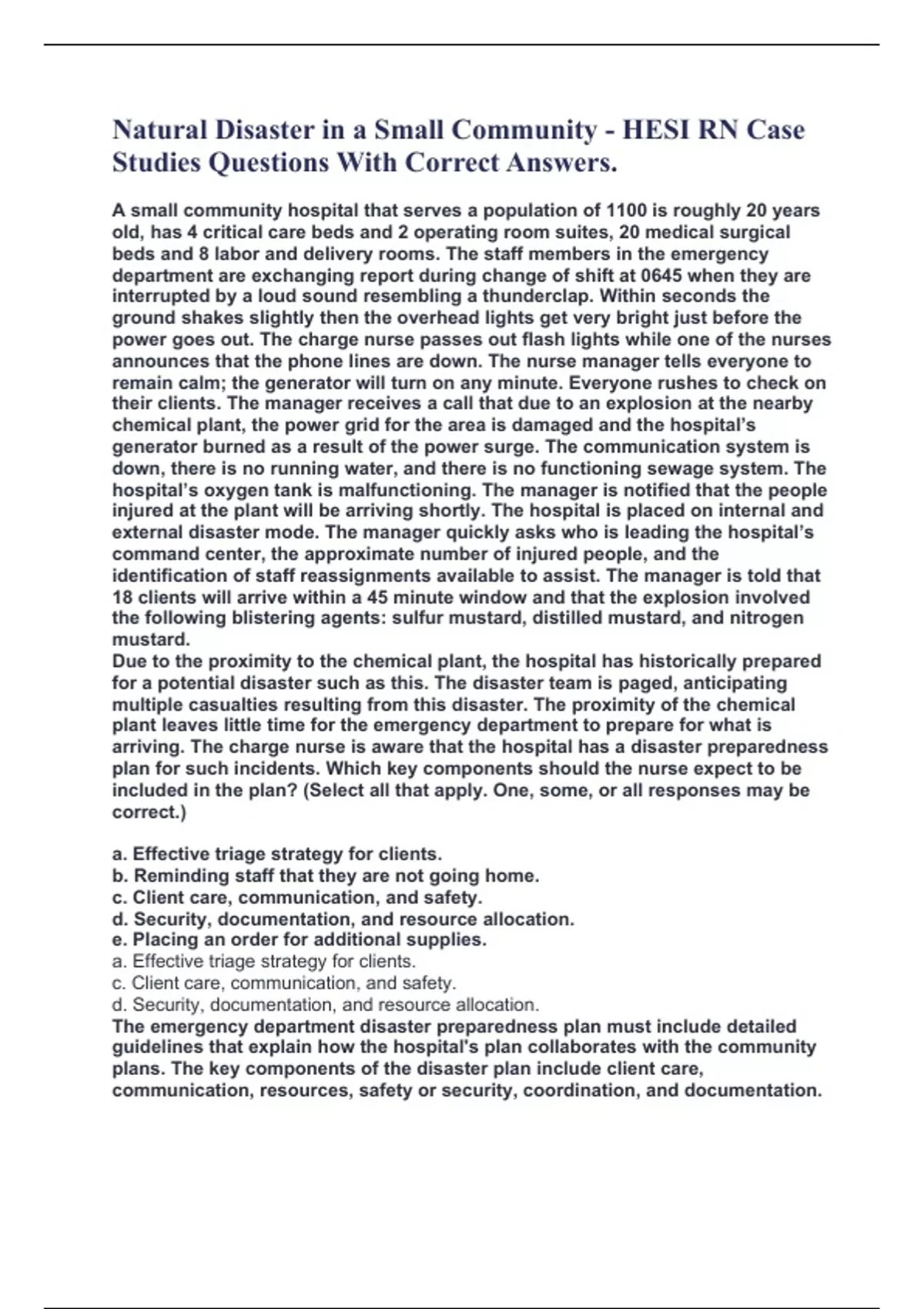 Natural Disaster in a Small Community - HESI RN Case Studies Questions With Correct Answers.
