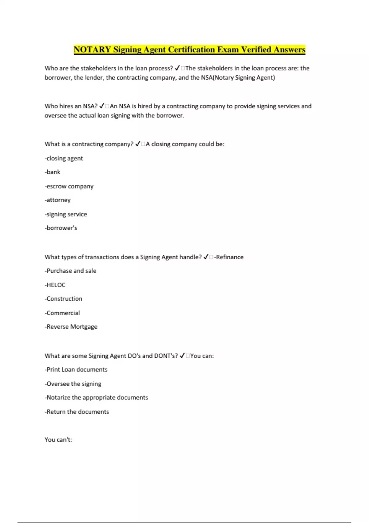 NOTARY Signing Agent Certification Exam Verified Answers Who are the stakeholders in the loan process? ️The stakeholders in the loan process are: the borrower, the lender, the contracting company, and the NSA(Notary Signing Agent) Who hires an NSA? ️An NSA is hired by a contracting company to provide signing services and oversee the actual loan signing with the borrower. What is a contracting company? ️A closing company could be: -closing agent -bank -escrow company -attorney -signing service -borrower's What types of transactions does a Signing Agent handle? ️-Refinance -Purchase and sale -HELOC -Construction -Commercial -Reverse Mortgage What are some Signing Agent DO's and DONT's? ️You can: -Print Loan documents -Oversee the signing -Notarize the appropriate documents -Return the documents You can't: -Process loans -Conduct a settlement -Prepare documents -Offer am opinion or legal advice to the borrowers What are some examples of discriminatory or unfair practices? ️-refusing to perform signing or providing inferior services based on clients race, color, national origin, religion, gender, sexual orientation, disability, family or migratory status -making unprofessional and insensitive remarks about the clients culture, level of education or lifestyle -Prompting the perception of unwelcome advances or a lewd act Where does the NSA fit in the loan process? ️You may be the first or the only person the borrower meets. Although you are involved in only one step, the whole loan process hinges on how well you do your job. What are the key responsibilities of a Signing Agent? ️Key responsibilities: -Travel to the borrower -Oversee the Signing -Collect stipulations and notarize applicable documents -Ensure that the documents are signed, dated or initialed properly -Review all the documents -Return the documents to the contracting company. How does a Signing Agent's performance affect the SLA(Service Level Agreement)? ️Your poor performance can negatively affect the payment to the contracting company How can a Signing Agent provide superior customer service ️You can: -Be positive and Confident -Be Prompt -Be accurate -Be dependable What Is the difference between brokered and direct assignments? ️Brokered assignments -contracted with a signing service -need not market yourself -steady stream of work -Pays flat rate -Will work with less experienced notary signing agent's Direct assignments -contracted directly with lenders, escrow agents, etc. -rate may be negotiated -Quick payment -only work with experienced notary signing agent's How can you maintain your professionalism in different environments? ️-manage your home environment on a call -act professionally: phone, email and texting What do I do if the documents are in electronica format? ️-receive documents via email or access contracting -print documents on laser printer -erase documents from your hard drive when the appointment is finished What basic steps are involved in prepping the documents for the signing appointment? ️1) look for a specific lender instructions 2)Use the prep sheet to organize the packet into note the stacking order 3)Check in flag the documents 4)Compile a list of questions for the contracting company, if necessary What information should you look for in the lender instructions? ️-Who to call with questions during the signing -what you should collect from the borrowers -Number of copies to print -ink color of the pen -Special initial or signature instructions How do you check and flag documents? ️-Place a sticky note at the beginning of each document -Maintain the stacking order -Place the closing disclosure or HUD-1 on top -Look through every page in the packet and place a sticker for each signature/initial/date
