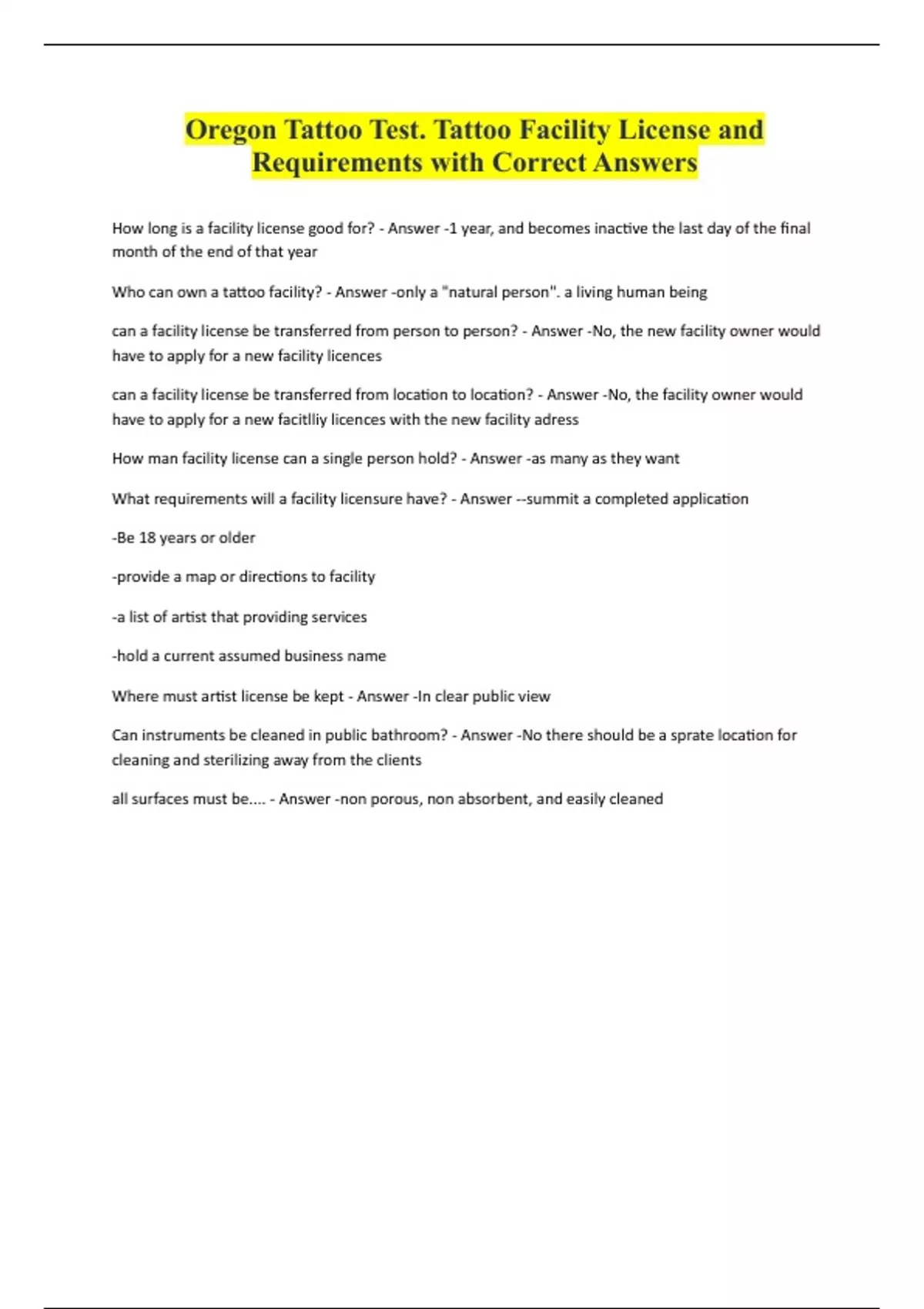 Oregon Tattoo Test. Tattoo Facility License and Requirements with Correct Answers How long is a facility license good for? - Answer -1 year, and becomes inactive the last day of the final month of the end of that year Who can own a tattoo facility? - Answer -only a "natural person". a living human being can a facility license be transferred from person to p