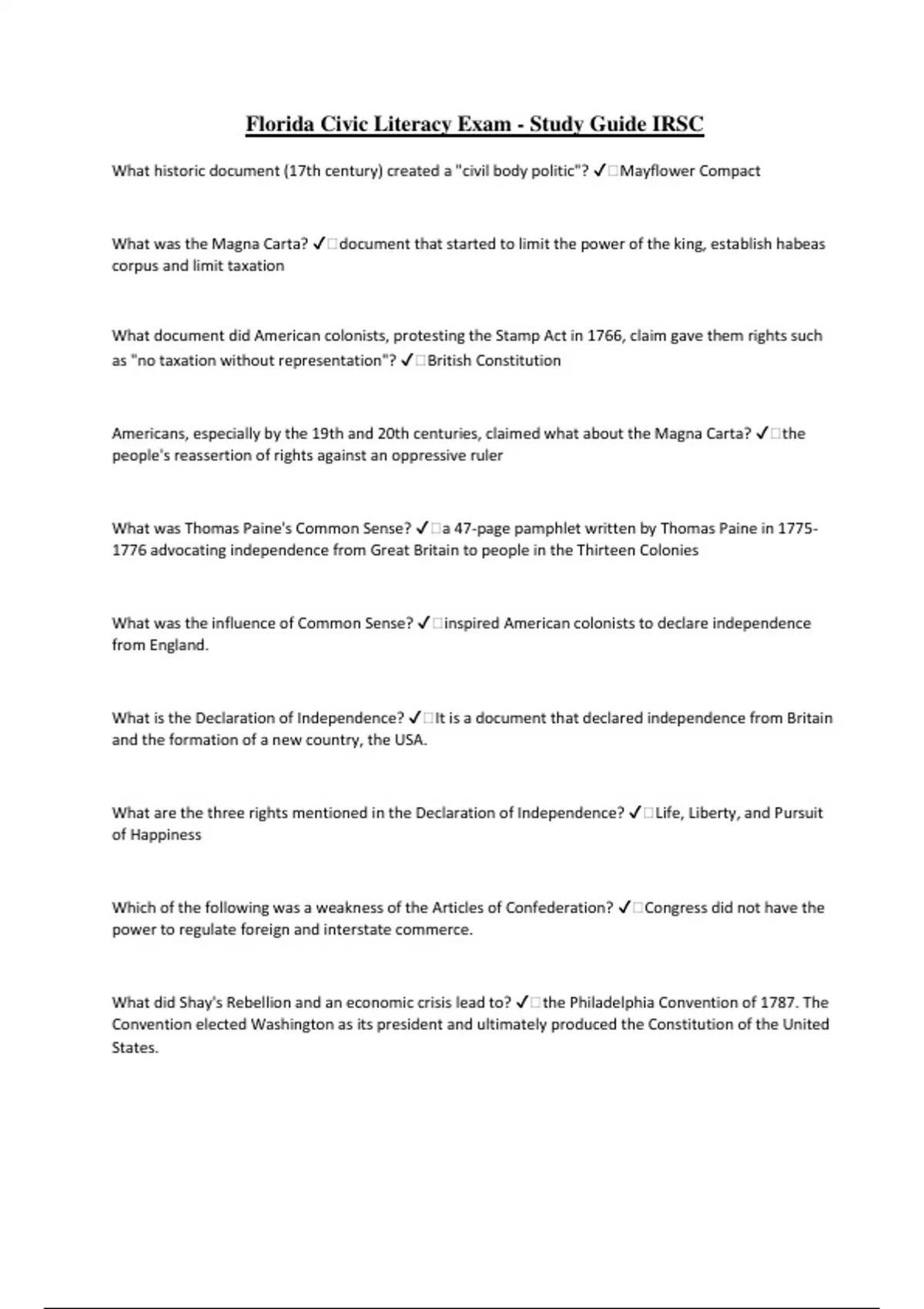 Florida Civic Literacy Exam - Study Guide IRSC What historic document (17th century) created a "civil body politic"? ️Mayflower Compact What was the Magna Carta? ️document that started to limit the power of the king, establish habeas corpus and limit taxation What document did American colonists, protesting the Stamp Act in 1766, claim gave them rights such as "no taxation without representation"? ️British Constitution Americans, especially by the 19th and 20th centuries, claimed what about the Magna Carta? ️the people's reassertion of rights against an oppressive ruler What was Thomas Paine's Common Sense? ️a 47-page pamphlet written by Thomas Paine in 1775 1776 advocating independence from Great Britain to people in the Thirteen Colonies What was the influence of Common Sense? ️inspired American colonists to declare independence from England. What is the Declaration of Independence? ️It is a document that declared independence from Britain and the formation of a new country, the USA. What are the three rights mentioned in the Declaration of Independence? ️Life, Liberty, and Pursuit of Happiness Which of the following was a weakness of the Articles of Confederation? ️Congress did not have the power to regulate foreign and interstate commerce. What did Shay's Rebellion and an economic crisis lead to? ️the Philadelphia Convention of 1787. The Convention elected Washington as its president and ultimately produced the Constitution of the United States. The idea of self-government is in the first three words of the Constitution. What are these words? ️We the people What is the Supreme Law of the Land? ️The constitution What were the 88 essays published in newspaper to support ratification of the Constitution are known as? Who wrote those essays? ️The Federalist Papers, written by Alexander Hamilton, John Jay, and James Madison What type of government does the US have? ️representative democracy What is federalism? ️sharing of powers between federal and state governments. What type of economic system does the U.S. have? ️capitalism and a mixed market system In a representative democracy (republic), who is sovereign? ️The people Under the U.S. Constitution, what has the power to declare war, conduct foreign policy, and coin currency? ️Congress Under the U.S. Constitution, what usually has the power to regulate local safety, schools, and gran