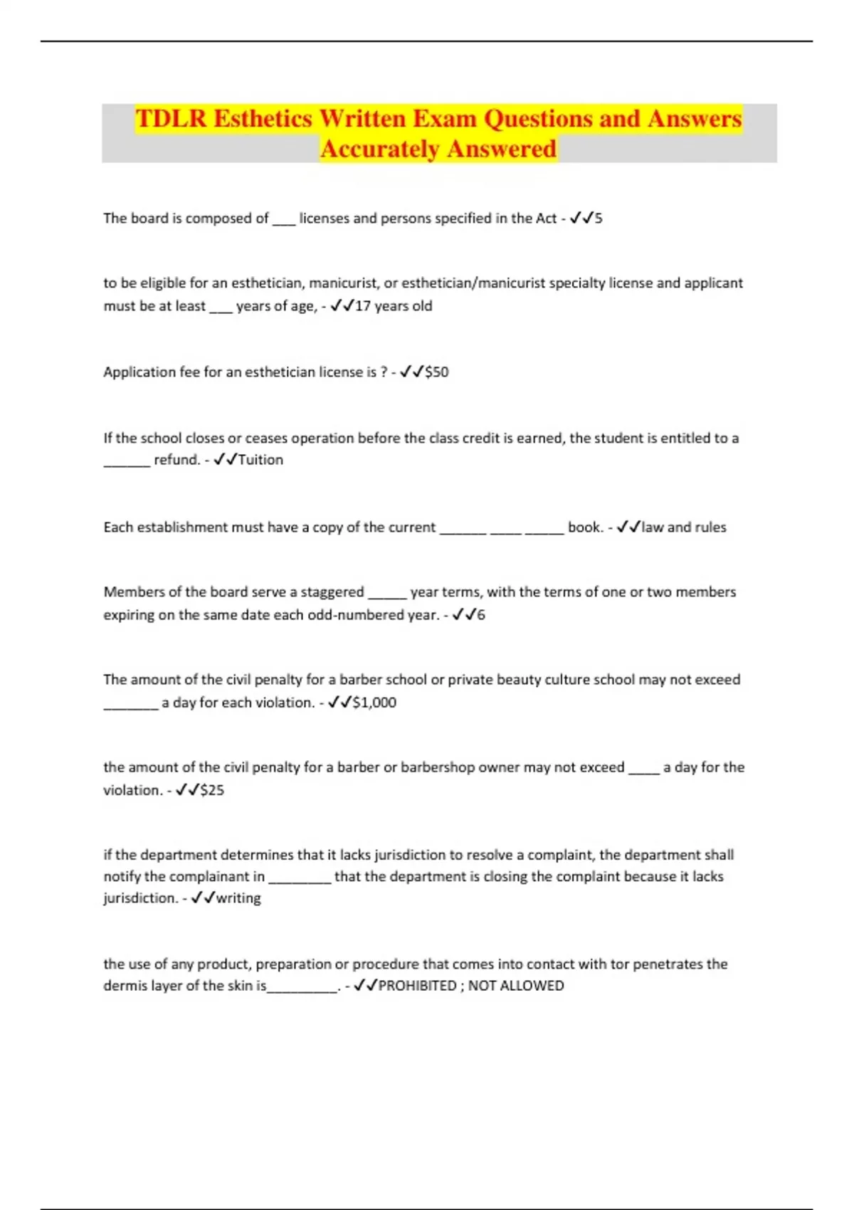 The board is composed of ___ licenses and persons specified in the Act - 5 to be eligible for an esthetician, manicurist, or esthetician/manicurist specialty license and applicant must be at least ___ years of age, - 17 years old Application fee for an esthetician license is ? - $50 If the school closes or ceases operation before the class credit is earned, the student is entitled to a ______ refund. - Tuition Each establishment must have a copy of the current ______ ____ _____ book. - law and rules Members of the board serve a staggered _____ year terms, with the terms of one or two members expiring on the same date each odd-numbered year. - 6 The amount of the civil penalty for a barber school or private beauty culture school may not exceed _______ a day for each violation. - $1,000 the amount of the civil penalty for a barber or barbershop owner may not exceed ____ a day for the violation. - $25 if the department determines that it lacks jurisdiction to resolve a complaint, the department shall notify the complainant in ________ that the department is closing the complaint because it lacks jurisdiction. - writing the use of any product, preparation or procedure that comes into contact with tor penetrates the dermis layer of the skin is_________. - PROHIBITED ; NOT ALLOWED