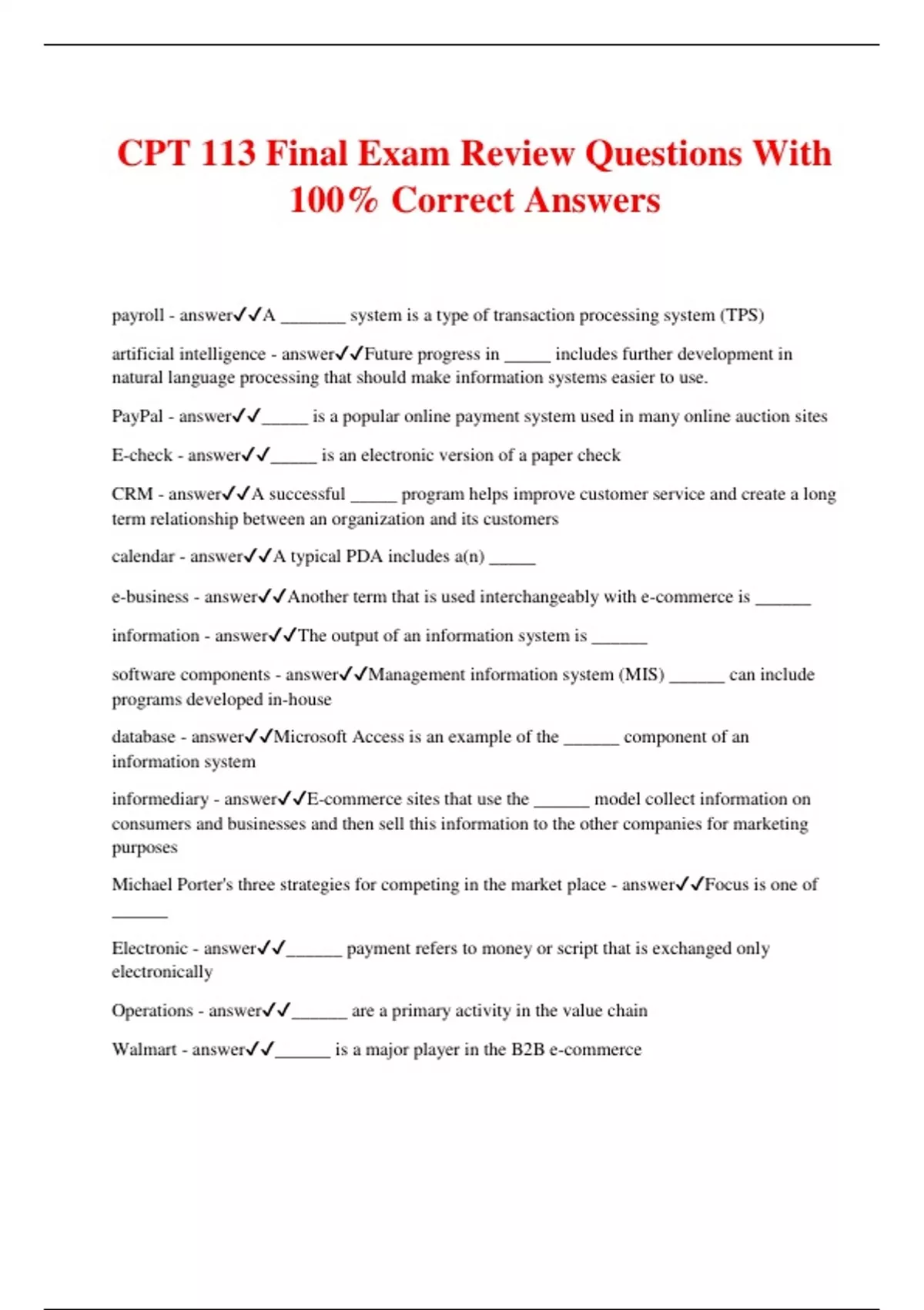 CPT 113 Final Exam Review Questions With 100% Correct Answers payroll - answerA _______ system is a type of transaction processing system (TPS) artificial intelligence - answerFuture progress in _____ includes further development in natural language processing that should make information systems easier to use. PayPal - answer_____ is a popular online payment system used in many online auction sites E-check - answer_____ is an electronic version of a paper check CRM - answerA successful _____ program helps improve customer service and create a long term relationship between an organization and its customers calendar - answerA typical PDA includes a(n) _____ e-business - answerAnother term that is used interchangeably with e-commerce is ______ information - answerThe output of an information system is ______ software components - answerManagement information system (MIS) ______ can include programs developed in-house database - answerMicrosoft Access is an example of the ______ component of an information system informediary - answerE-commerce sites that use the ______ model collect information on consumers and businesses and then sell this information to the other companies for marketing purposes Michael Porter's three strategies for competing in the market place - answerFocus is one of ______ Electronic - answer______ payment refers to money or script that is exchanged only electronically Operations - answer______ are a primary activity in the value chain Walmart - answer______ is a major player in the B2B e-commerce push - answerWith ______ technology, information is sent to users based on their previous inquiries, interests, or specifications eBay - answer______ is a site that facilitates C2C e-commerce third-party exchange marketplace - answerA ______ generates revenues from the fees charged for matching buyers and sellers Michael Porter - answer______ introduced the value chain concept internal data - answerSales records are an example of the ______ component of an information system database administrator - answerA ______ should have knowledge and understanding of data warehouse and data mining tools Computer literacy - answer______ means having a basic knowledge of hardware and software, the internet, and collaboration tools and technologies MIS - answerAn ______ is an organized integration of hardware and software technologies, data processes, and human elements designed to produce timely, integrated, relevant, accurate, and useful information for decision making purposes data - answerThe ______ of an information system is considered the input to the system database - answerA ______ is the heart of an information system process - answerThe purpose of an information system's ______ component is generating the most useful type of information for making decisions information system - answerThe ultimate goal of an ______ is to generate business intelligence LIS - answerA ______ is designed to reduce the cost of transportation materials while maintaining safe and reliable delivery timely - answerThe goal of a financial information system (FIS) is to provide information to financial executives in a ______ manner CIO - answerThe top information systems job belongs to the chief technology officer (CTO) or the ______ encompasses - answerE-business ______ all activities a company performs for selling an buying products and services, using computers and communication technologies. E-commerce - answer______ is buying and selling goods and services over the internet and is part of E-business