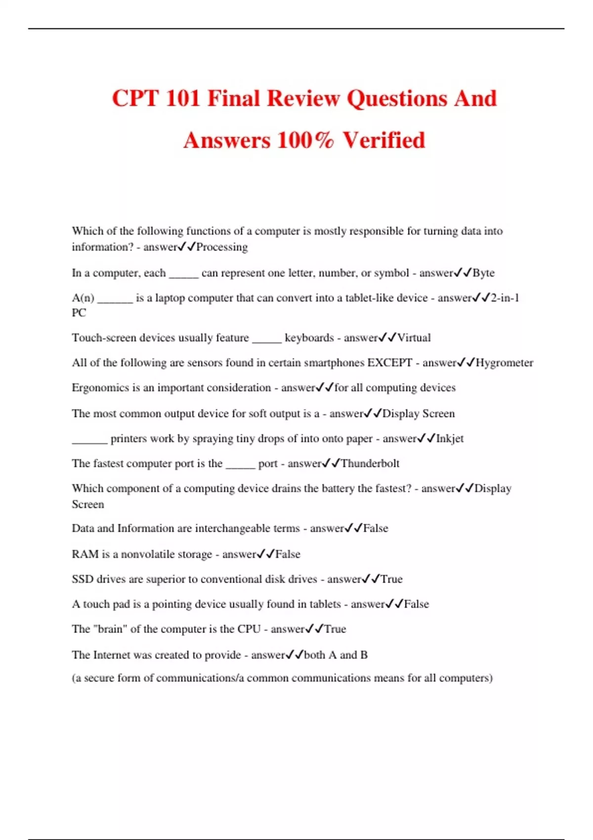 CPT 101 Final Review Questions And Answers 100% Verified Which of the following functions of a computer is mostly responsible for turning data into information? - answerProcessing In a computer, each _____ can represent one letter, number, or symbol - answerByte A(n) ______ is a laptop computer that can convert into a tablet-like device - answer2-in-1 PC Touch-screen devices usually feature _____ keyboards - answerVirtual All of the following are sensors found in certain smartphones EXCEPT - answerHygrometer Ergonomics is an important consideration - answerfor all computing devices The most common output device for soft output is a - answerDisplay Screen ______ printers work by spraying tiny drops of into onto paper - answerInkjet The fastest computer port is the _____ port - answerThunderbolt Which component of a computing device drains the battery the fastest? - answerDisplay Screen Data and Information are interchangeable terms - answerFalse RAM is a nonvolatile storage - answerFalse SSD drives are superior to conventional disk drives - answerTrue A touch pad is a pointing device usually found in tablets - answerFalse The "brain" of the computer is the CPU - answerTrue The Internet was created to provide - answerboth A and B (a secure form of communications/a common communications means for all computers) Which of the following describes an IP address - answerAll of he Above (It identifies a website/ it is referred to as a dotted quad/ it identifies any computer connecting to the internet) Ordering a mocha latte and paying for it from the Starbucks smartphone app is using what type of internet commerce? - answerMobile Commerce What web browser feature would be particularly useful when using public computers? - answerPrivacy Browsing In the URL answerhttp Search engines that search other search engines are called - answermetasearch engines If you would like to return to a website that you visited last week but can't remember the URL, you should look at: - answerthe History list Ensuring that the content, tone, and style of a website match your needs is checking for: - answerAudience what is not a good precaution to take when making online purchases? - answerpay by debit card, not credit card You want to search the web for information on the movie Captain America: Civil War. What would be the best way to enter the key terms to get the most specific results? - answer"Captain America: Civil War" Geolocation requires a GPS chip in a mobile device. - answerTrue Webcasts are delivered only as prerecorded audio and video content. - answerFalse The "S" in HTTPS stands for secure and indicates that the secure sockets layer protocol has been applied to the website. - answerTrue Digital activism is an exercise platform. - answerFalse A blog is usually written by a single author and often represents a personal log or journal. - answerTrue Software that includes programs to help you at work, home, and school is called: - answerApplication Software When a vendor hosts software on a website and you don't need to install the software on your device, this is known as: - answerSoftware as a Service Beta software is made available because - answera company is making an early release to test bugs.