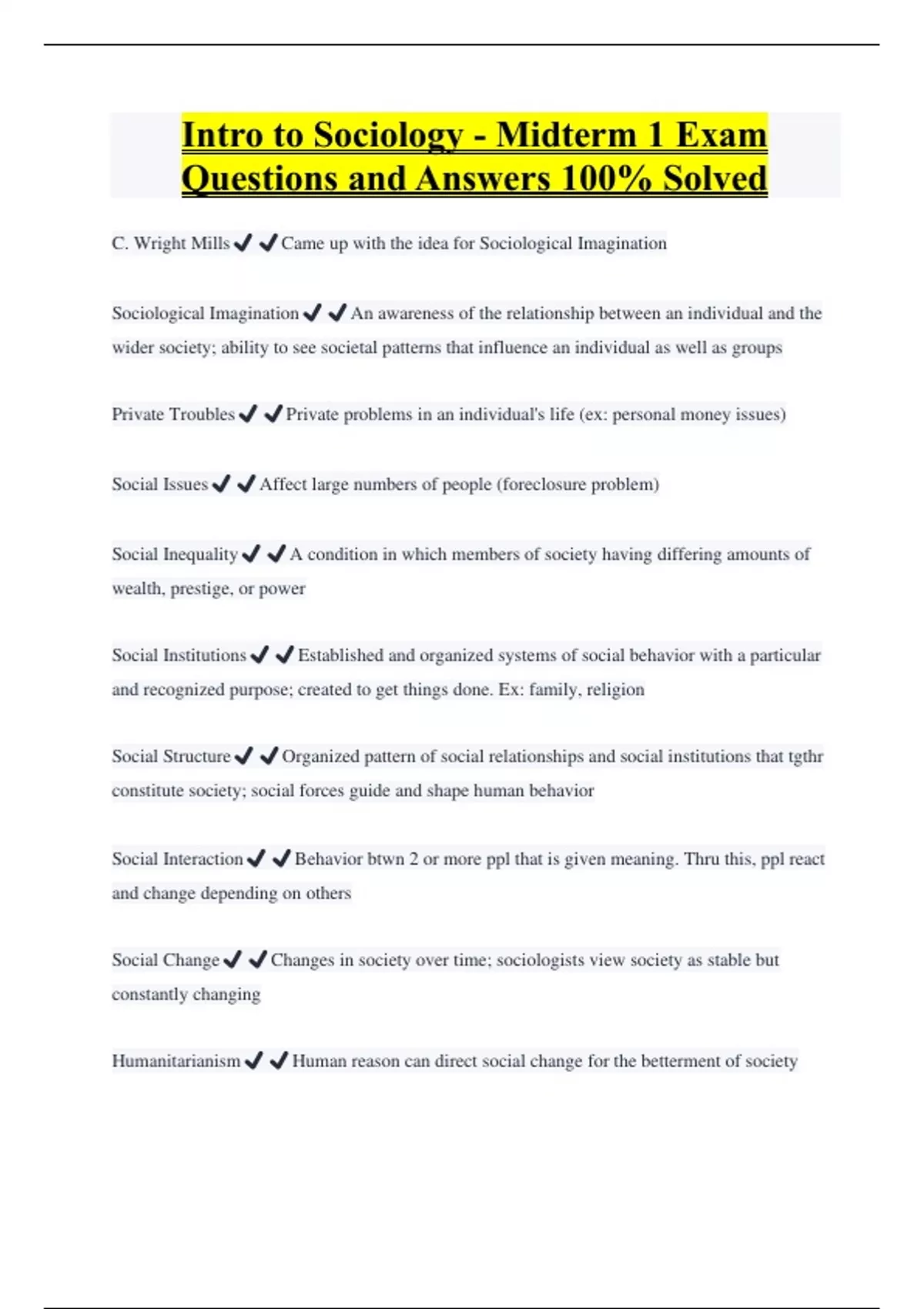 Intro to Sociology - Midterm 1 Exam Questions and Answers 100% Solved C. Wright Mills️️Came up with the idea for Sociological Imagination Sociological Imagination️️An awareness of the relationship between an individual and the wider society; ability to see societal patterns that influence an individual as well as groups Private Troubles️️Private problems in an individual's life (ex: personal money issues) Social Issues️️Affect large numbers of people (foreclosure problem) Social Inequality️️A condition in which members of society having differing amounts of wealth, prestige, or power Social Institutions️️Established and organized systems of social behavior with a particular and recognized purpose; created to get things done. Ex: family, religion Social Structure️️Organized pattern of social relationships and social institutions that tgthr constitute society; social forces guide and shape human behavior Social Interaction️️Behavior btwn 2 or more ppl that is given meaning. Thru this, ppl react and change depending on others Social Change️️Changes in society over time; sociologists view society as stable but constantly changing