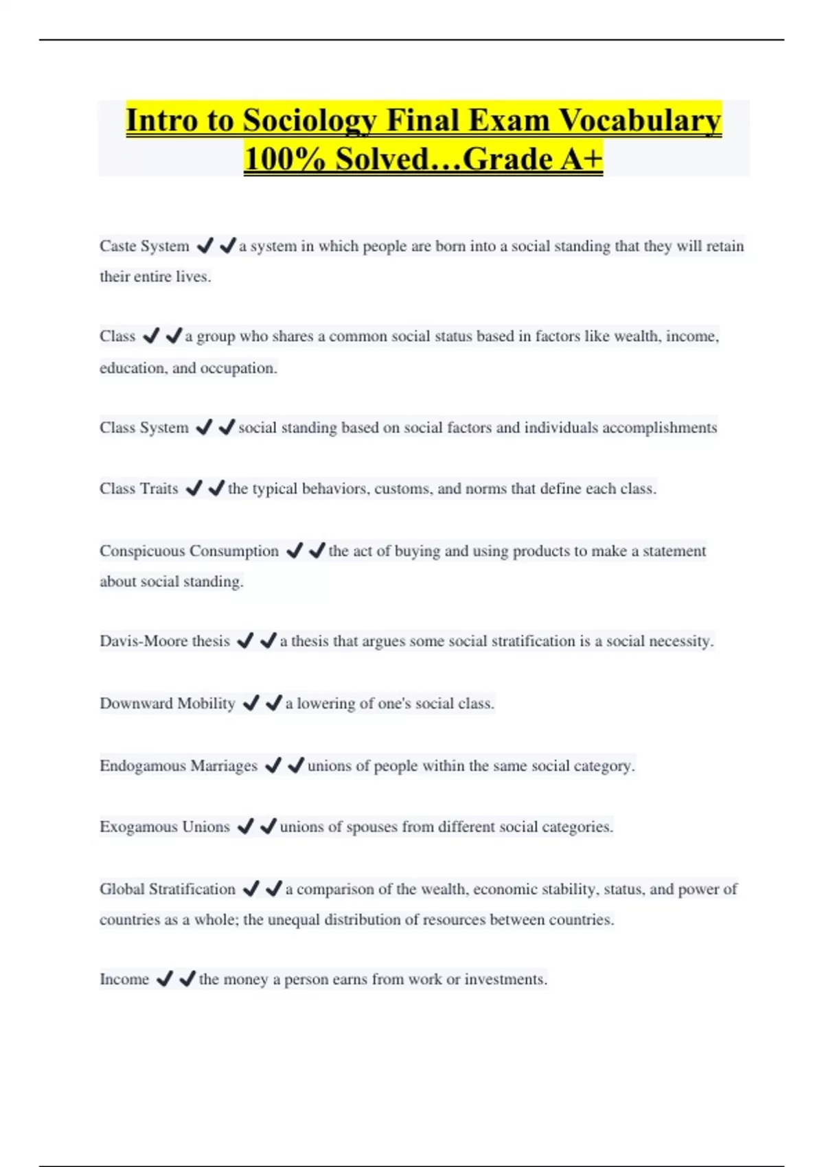 Intro to Sociology Final Exam Vocabulary 100% Solved…Grade A+ Caste System ️️a system in which people are born into a social standing that they will retain their entire lives. Class ️️a group who shares a common social status based in factors like wealth, income, education, and occupation. Class System ️️social standing based on social factors and individuals accomplishments Class Traits ️️the typical behaviors, customs, and norms that define each class. Conspicuous Consumption ️️the act of buying and using products to make a statement about social standing. Davis-Moore thesis ️️a thesis that argues some social stratification is a social necessity. Downward Mobility ️️a lowering of one's social class. Endogamous Marriages ️️unions of people within the same social category. Exogamous Unions ️️unions of spouses from different social categories