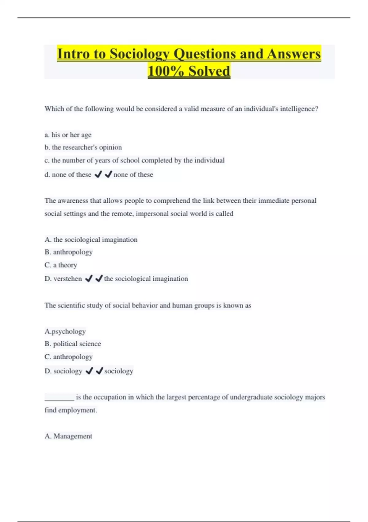 Intro to Sociology Questions and Answers 100% Solved Which of the following would be considered a valid measure of an individual's intelligence? a. his or her age b. the researcher's opinion c. the number of years of school completed by the individual d. none of these ️️none of these The awareness that allows people to comprehend the link between their immediate personal social settings and the remote, impersonal social world is called A. the sociological imagination B. anthropology C. a theory D. verstehen ️️the sociological imagination The scientific study of social behavior and human groups is known as A.psychology B. political science C. anthropology D. sociology ️️sociology Which of the following would be considered a valid measure of an individual's intelligence? a. his or her age b. the researcher's opinion c. the number of years of school completed by the individual d. none of these ️️none of these The awareness that allows people to comprehend the link between their immediate personal social settings and the remote, impersonal social world is called A. the sociological imagination B. anthropology C. a theory D. verstehen ️️the sociological imagination The scientific study of social behavior and human groups is known as A.psychology B. political science C. anthropology D. sociology ️️sociology