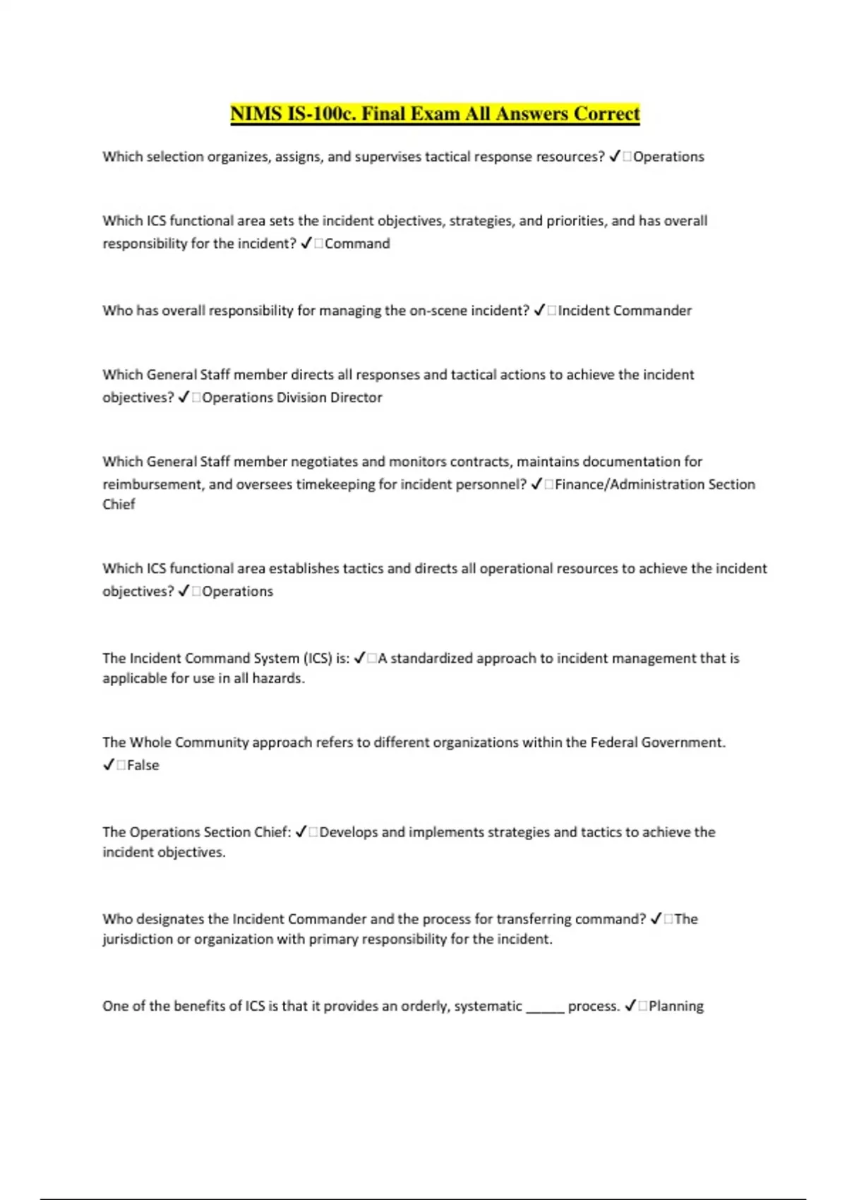 NIMS IS-100c. Final Exam All Answers Correct Which selection organizes, assigns, and supervises tactical response resources? ️Operations Which ICS functional area sets the incident objectives, strategies, and priorities, and has overall responsibility for the incident? ️Command Who has overall responsibility for managing the on-scene incident? ️Incident Commander Which General Staff member directs all responses and tactical actions to achieve the incident objectives? ️Operations Division Director Which General Staff member negotiates and monitors contracts, maintains documentation for reimbursement, and oversees timekeeping for incident personnel? ️Finance/Administration Section Chief Which ICS functional area establishes tactics and directs all operational resources to achieve the incident objectives? ️Operations The Incident Command System (ICS) is: ️A standardized approach to incident management that is applicable for use in all hazards. The Whole Community approach refers to different organizations within the Federal Government. ️False The Operations Section Chief: ️Develops and implements strategies and tactics to achieve the incident objectives. Who designates the Incident Commander and the process for transferring command? ️The jurisdiction or organization with primary responsibility for the incident. One of the benefits of ICS is that it provides an orderly, systematic _____ process.