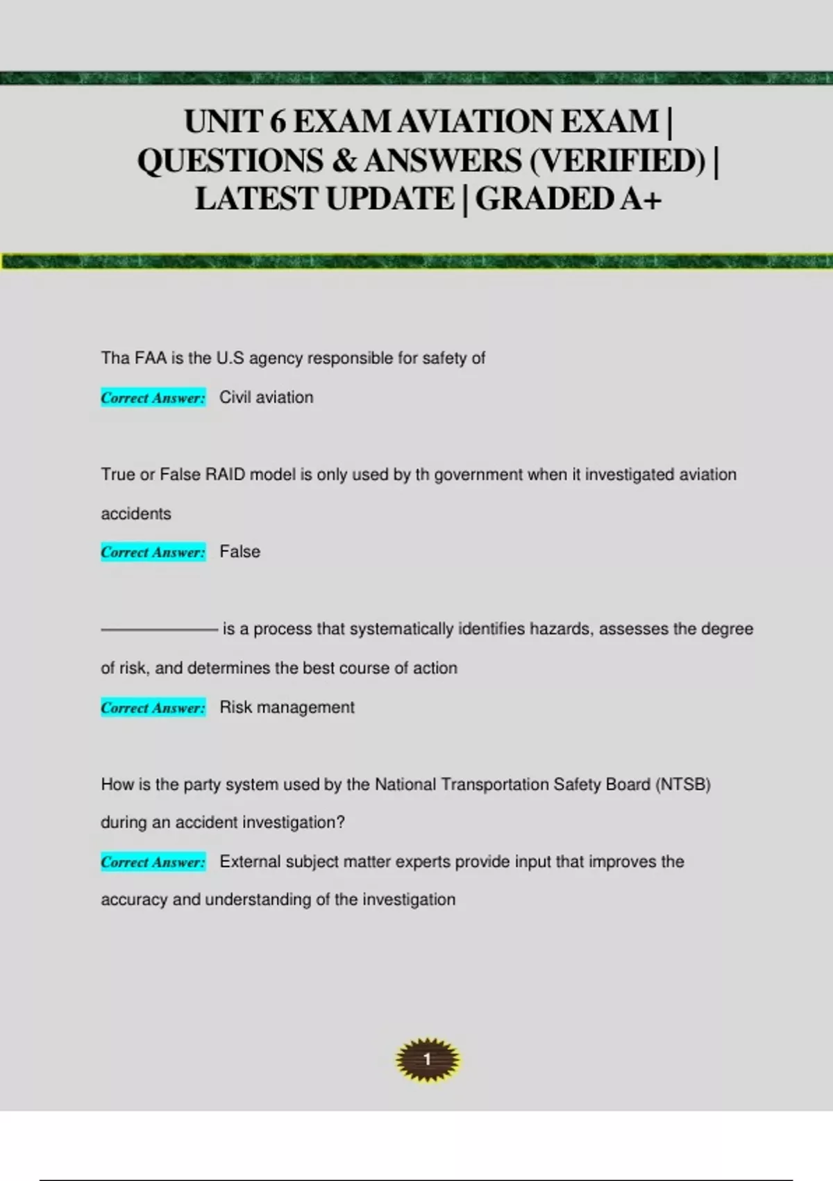 Tha FAA is the U.S agency responsible for safety of Correct Answer: Civil aviation True or False RAID model is only used by th government when it investigated aviation accidents Correct Answer: False ——————— is a process that systematically identifies hazards, assesses the degree of risk, and determines the best course of action Correct Answer: Risk management How is the party system used by the National Transportation Safety Board (NTSB) during an accident investigation? Correct Answer: External subject matter experts provide input that improves the accuracy and understanding of the investigation