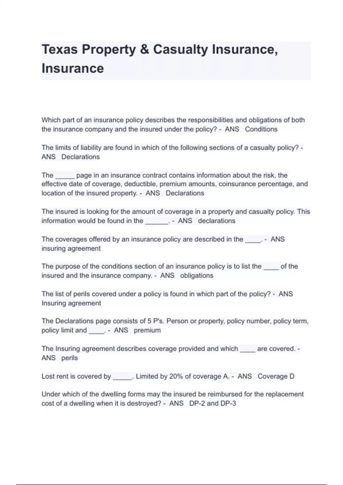 Texas Property & Casualty Insurance, Insurance Exam Questions And Answers Which part of an insurance policy describes the responsibilities and obligations of both the insurance company and the insured under the policy? - ANS Conditions The limits of liability are found in which of the following sections of a casualty policy? - ANS Declarations The _____ page in an insurance contract contains information about the risk, the effective date of coverage, deductible, premium amounts, coinsurance percentage, and location of the insured property. - ANS Declarations The insured is looking for the amount of coverage in a property and casualty policy. This information would be found in the ______. - ANS declarations The coverages offered by an insurance policy are described in the ____. - ANS insuring agreement The purpose of the conditions section of an insurance policy is to list the ____ of the insured and the insurance company. - ANS obligations The list of perils covered under a policy is found in which part of the policy? - ANS Insuring agreement The Declarations page consists of 5 P's. Person or property, policy number, policy term, policy limit and ____. - ANS premium The Insuring agreement describes coverage provided and which ____ are covered. - ANS perils Lost rent is covered by _____. Limited by 20% of cover
