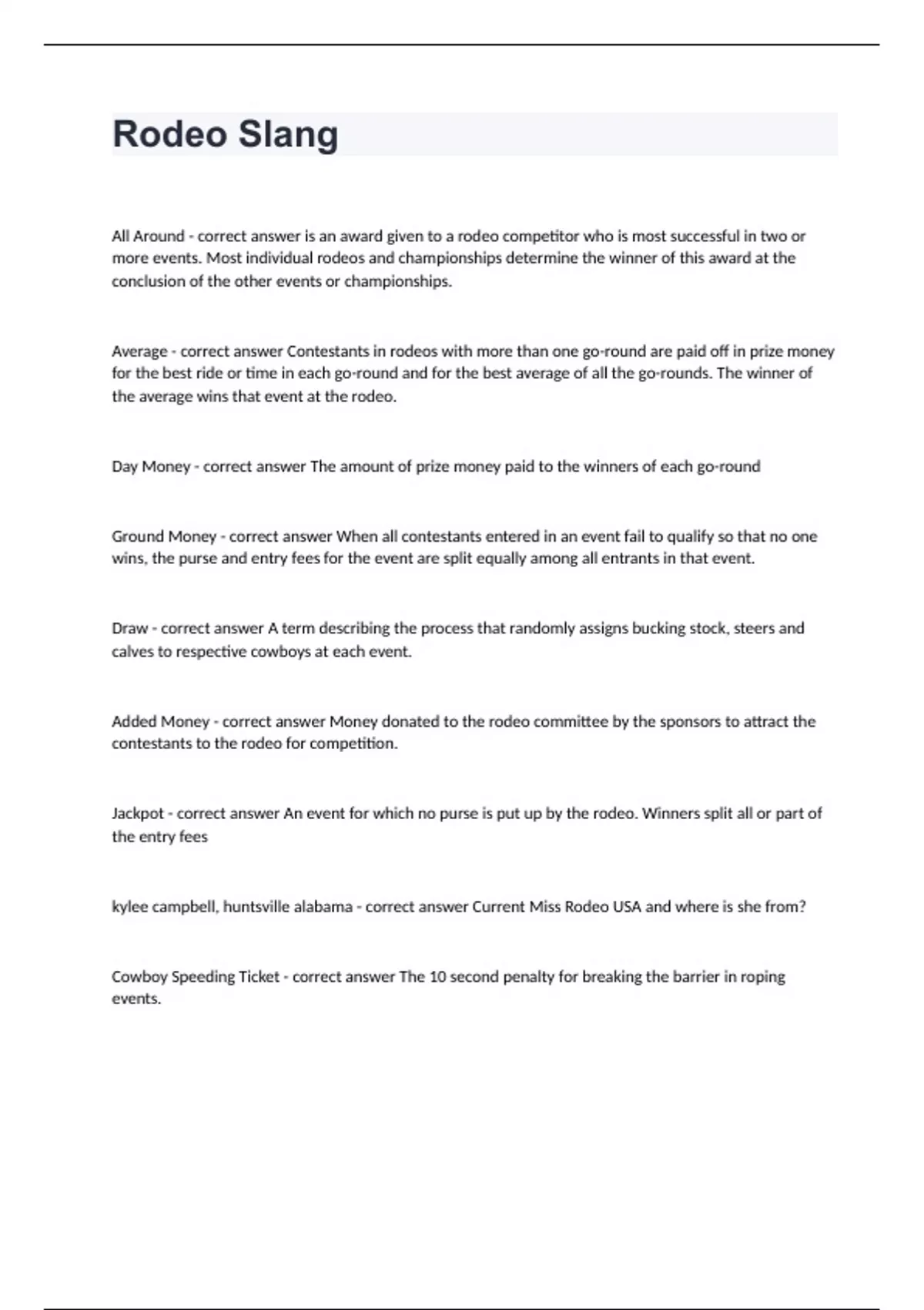 Rodeo SlangAll Around - correct answer is an award given to a rodeo competitor who is most successful in two or more events. Most individual rodeos and championships determine the winner of this award at the conclusion of the other events or championships. Average - correct answer Contestants in rodeos with more than one go-round are paid off in prize money for the best ride or time in each go-round and for the best average of all the go-rounds. The winner of the average wins that event at the rodeo. Day Money - correct answer The amount of prize money paid to the winners of each go-round Ground Money - correct answer When all contestants entered in an event fail to qualify so that no one wins, the purse and entry fees for the event are split equally among all entrants in that event. Draw - correct answer A term describing the process that randomly assigns bucking stock, steers and calves to respective cowboys at each event. Added Money - correct answer Money donated to the rodeo committee by the sponsors to attract the contestants to the rodeo for competition. Jackpot - correct answer An event for which no purse is put up by the rodeo. Winners split all or part of the entry fees kylee campbell, huntsville alabama - correct answer Current Miss Rodeo USA and where is she from? Cowboy Speeding Ticket - correct answer The 10 second penalty for breaking the barrier in roping events.