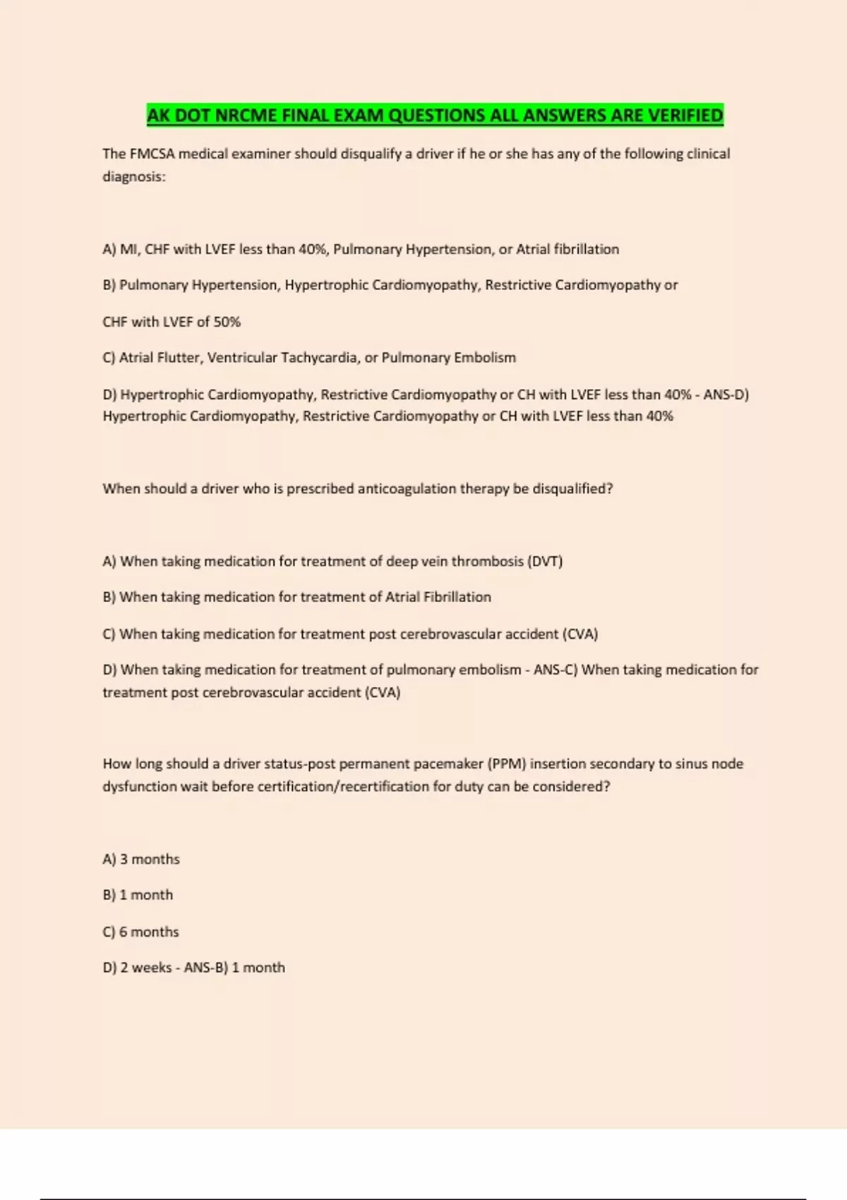 AK DOT NRCME FINAL EXAM QUESTIONS ALL ANSWERS ARE VERIFIED The FMCSA medical examiner should disqualify a driver if he or she has any of the following clinical diagnosis: A) MI, CHF with LVEF less than 40%, Pulmonary Hypertension, or Atrial fibrillation B) Pulmonary Hypertension, Hypertrophic Cardiomyopathy, Restrictive Cardiomyopathy or CHF with LVEF of 50% C) Atrial Flutter, Ventricular Tachycardia, or Pulmonary Embolism D) Hypertrophic Cardiomyopathy, Restrictive Cardiomyopathy or CH with LVEF less than 40% - ANS-D) Hypertrophic Cardiomyopathy, Restrictive Cardiomyopathy or CH with LVEF less than 40% When should a driver who is prescribed anticoagulation therapy be disqualified? A) When taking medication for treatment of deep vein thrombosis (DVT) B) When taking medication for treatment of Atrial Fibrillation C) When taking medication for treatment post cerebrovascular accident (CVA) D) When taking medication for treatment of pulmonary embolism - ANS-C) When taking medication for treatment post cerebrovascular accident (CVA) How long should a driver status-post permanent pacemaker (PPM) insertion secondary to sinus node dysfunction wait before certification/recertification for duty can be considered? A) 3 months B) 1 month C) 6 months D) 2 weeks - ANS-B) 1 month A CMV driver who has an implantable cardioverter-defibrillator (ICD) can be certified for how long when he or she has clearance from a cardiologist indicating that the driver is fit for duty?...