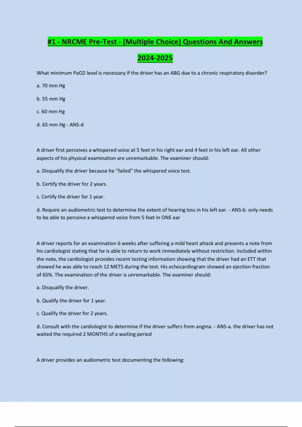 #1 - NRCME Pre-Test - (Multiple Choice) Questions And Answers What minimum PaO2 level is necessary if the driver has an ABG due to a chronic respiratory disorder? a. 70 mm Hg b. 55 mm Hg c. 60 mm Hg d. 65 mm Hg - ANS-d A driver first perceives a whispered voice at 5 feet in his right ear and 4 feet in his left ear. All other aspects of his physical examination are unremarkable. The examiner should: a. Disqualify the driver because he "failed" the whispered voice test. b. Certify the driver for 2 years. c. Certify the driver for 1 year. d. Require an audiometric test to determine the extent of hearing loss in his left ear. - ANS-b. only needs to be able to perceive a whispered voice from 5 feet in ONE ear A driver reports for an examination 6 weeks after suffering a mild heart attack and presents a note from his cardiologist stating that he is able to return to work immediately without restriction. Included within the note, the cardiologist provides recent testing information showing that the driver had an ETT that showed he was able to reach 12 METS during the test. His echocardiogram showed an ejection fraction of 65%. The examination of the driver is unremarkable. The examiner should: a. Disqualify the driver. b. Qualify the driver for 1 year. c. Qualify the driver for 2 years. d. Consult with the cardiologist to determine if the driver suffers from angina. - ANS-a. the driver has not waited the required 2 MONTHS of a waiting period A driver provides an audiometric test documenting the following: 500 Hz: 35 Right ear; 40 Left ear 1000 HZ:40 Right ear; 45 Left ear 2000 HZ:40 Right ear; 45 Left ear 4000 Hz:50 Right ear; 50 Left ear The medical examiner should: a. Disqualify the driver because he does not meet minimum hearing requirements to drive. b. Certify the driver for 2 years. c. Certify the driver for 1 year. d. Require the driver to obtain a hearing exemption. - ANS-b. average the results from 500, 1000, and 2000Hz. The average is 38.33 in the right and 43.33 in the left. Average hearing loss must be less than or equal to 40 in the better ear (doesn't have to be met in both ears) During the examination of a commercial driver, the examiner notices that the driver's peripheral vision is 70 degrees to the left and 80 degrees to the right. The examiner should: a. Qualify the driver for 2 years. b. Require the driver to obtain a vision exemption because of the limitation in the driver's left peripheral field. c. Disqualify the driver. d. Have the driver consult with an Ophthalmologist to determine if the driver's peripheral vision meets minimum standards. - ANS-um of 70 degrees bilaterally During examination, the medical examiner notices that the driver is distant, lacks eye contact and shows absolutely no emotional response during the exam. The examiner's best response should be: a. Provide the driver with a "CAGE" questionnaire to determine if he suffers from alcoholism. b. Disqualify the driver and refer him to a mental health profession prior to consideration for certification. c. Certify the driver with a 1-time, 3-month certificate to determine if there is any effect on the driver's ability to drive a CMV. d. Require a skill performance evaluation to ascertain if the driver has any limitations with driving. - ANSb. A driver admits to the use of marijuana for the treatment of his glaucoma, which is legal in theState in which he lives. He provides medical documentation for the glaucoma indicating he isable to drive a truck. He began using the marijuana about three months ago. His currentmedical card has no limitations listed and is for 2 years. His certification examination is within normal limits. The medical examiner should: a. Disqualify the driver. b. Perform a urine drug collection and provide the release from the testingprovider. c. Certify the driver for 1 year. d. Certify the driver for 2 years. - ANS-a. A driver has a blood pressure of 136/92 mm Hg. This is: a. Within normal limits and would not affect the driver's certification. b. Stage 1 Hypertension. c. Stage 2 Hypertension. d. Stage 3 Hypertension. - ANS-...