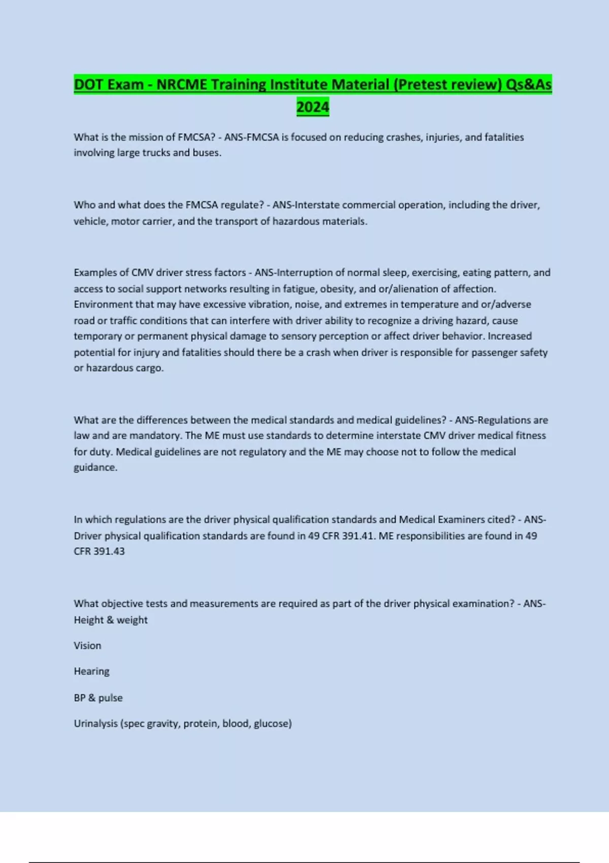 DOT Exam - NRCME Training Institute Material (Pretest review) Qs&As 2024
