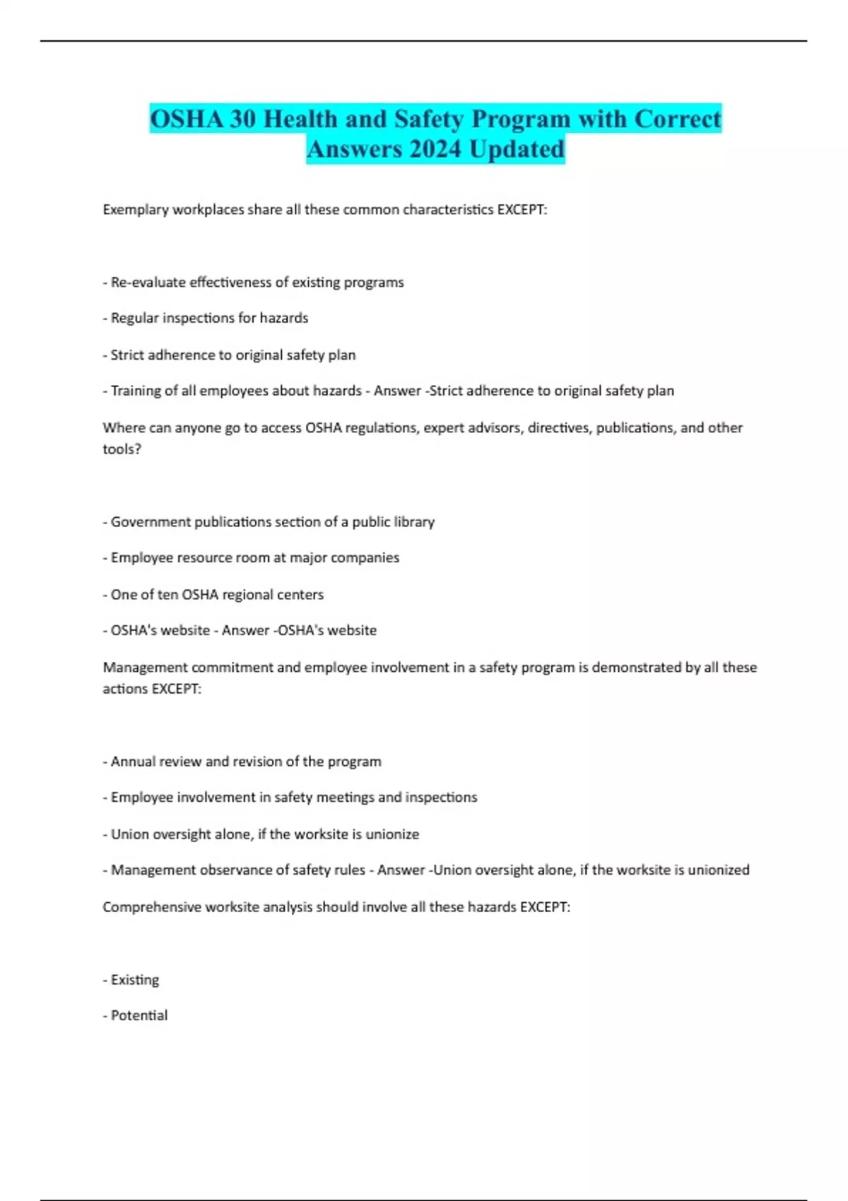 OSHA 30 Health and Safety Program with Correct Answers 2024 Updated Exemplary workplaces share all these common characteristics EXCEPT: - Re-evaluate effectiveness of existing programs - Regular inspections for hazards - Strict adherence to original safety plan - Training of all employees about hazards - Answer -Strict adherence to original safety plan Where can anyone go to access OSHA regulations, expert advisors, directives, publications, and other tools? - Government publications section of a public library - Employee resource room at major companies - One of ten OSHA regional centers - OSHA's website - Answer -OSHA's website Management commitment and employee involvement in a safety program is demonstrated by all these actions EXCEPT: - Annual review and revision of the program - Employee involvement in safety meetings and inspections - Union oversight alone, if the worksite is unionize - Management observance of safety rules - Answer -Union oversight alone, if the worksite is unionized Comprehensive worksite analysis should involve all these hazards EXCEPT