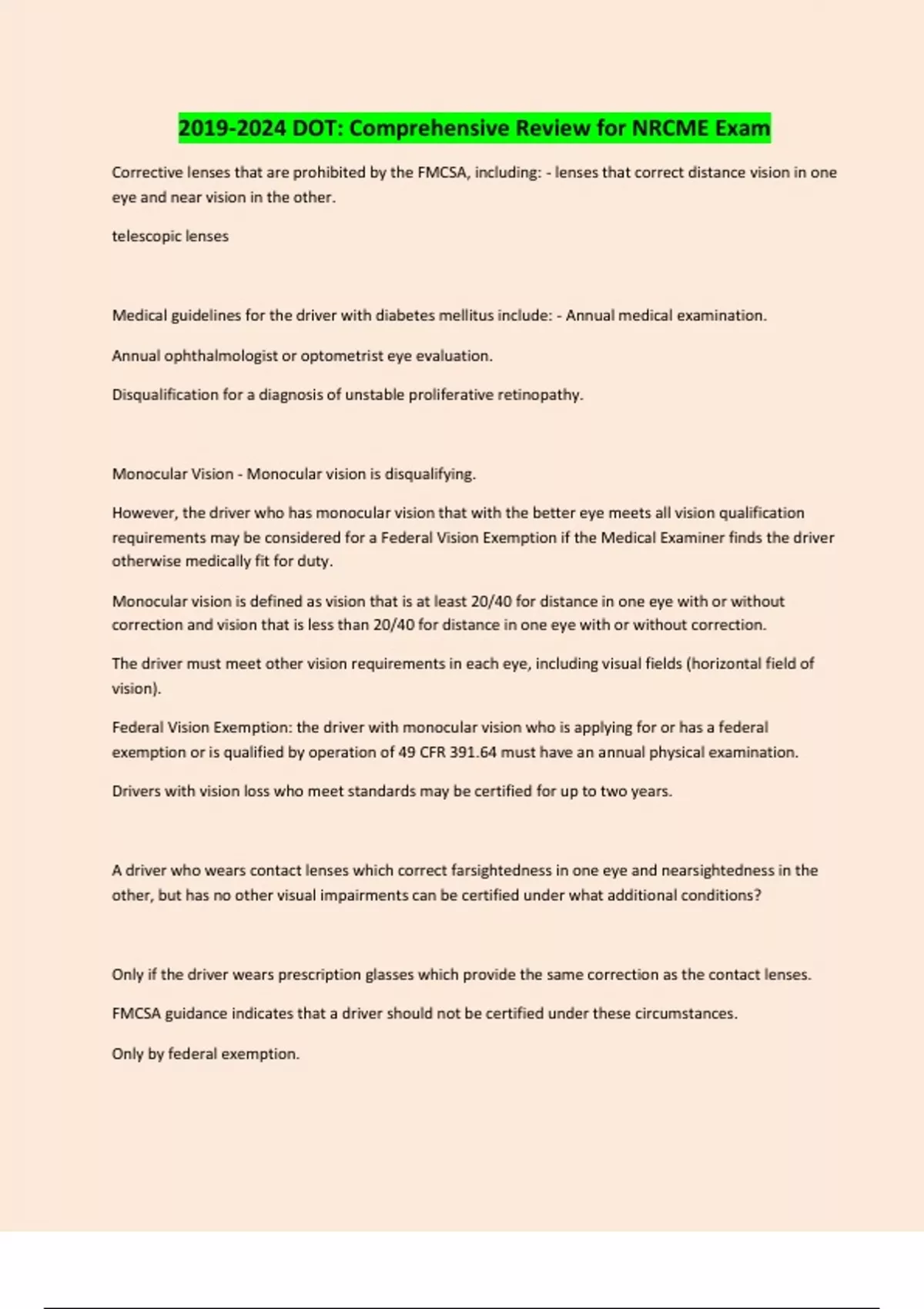 DOT: Comprehensive Review for NRCME Exam Corrective lenses that are prohibited by the FMCSA, including: - lenses that correct distance vision in one eye and near vision in the other. telescopic lenses Medical guidelines for the driver with diabetes mellitus include: - Annual medical examination. Annual ophthalmologist or optometrist eye evaluation. Disqualification for a diagnosis of unstable proliferative retinopathy. Monocular Vision - Monocular vision is disqualifying. However, the driver who has monocular vision that with the better eye meets all vision qualification requirements may be considered for a Federal Vision Exemption if the Medical Examiner finds the driver otherwise medically fit for duty. Monocular vision is defined as vision that is at least 20/40 for distance in one eye with or without correction and vision that is less than 20/40 for distance in one eye with or without correction. The driver must meet other vision requirements in each eye, including visual fields (horizontal field of vision). Federal Vision Exemption: the driver with monocular vision who is applying for or has a federal exemption or is qualified by operation of 49 CFR 391.64 must have an annual physical examination. Drivers with vision loss who meet standards may be certified for up to two years. A driver who wears contact lenses which correct farsightedness in one eye and nearsightedness in the other, but has no other visual impairments can be certified under what additional conditions? Only if the driver wears prescription glasses which provide the same correction as the contact lenses. FMCSA guidance indicates that a driver should not be certified under these circumstances. Only by federal exemption. The driver is always certifiable under these conditions. - FMCSA guidance indicates that a driver should not be certified under these circumstances. Explanation: FMCSA guidance indicates that contact lenses that correct one eye for distance and one eye for near vision are not acceptable. Guidance recommends not to certify with ear problem diagnoses of: - a) Uncontrolled vertigo. b) Ménière's disease. c) Nonfunctioning labyrinth. d) Nonfunctioning fistula. The medical examiner's role in the exemption process includes _________. Issuing the exemption. Issuing the prescription for the driver's contact lenses and/or glasses. Providing the driver with contact information for the Federal Vision Exemption Program. Assuring that the driver has peripheral vision of at least 110 degrees in each eye. - Providing the driver with contact information for the Federal Vision Exemption Program. Explanation: The medical examiner's role in the exemption process is limited to performing the driver examination and providing the driver with contact information for the FMCSA related to the exemption process. An audiometric test produces the following results: Left ear: 500 Hz, 35dB Loss; 1,000 Hz, 35 dB loss; 2,000 Hz 45 dB loss. Right ear: 500 Hz, 40 dB loss; 1,000 Hz, 45 dB loss; 2,000 40 dB loss. What is the certification? Certify for one year. Certify for two years. Do not certify. Certify only when accompanied by hearing aid. - Certify for two years. Explanation: Drivers with an average hearing loss of < 40 decibels averaged across 500, 1000, and 2000 Hz in the better ear may be certified for two years. What eye conditions must the medical examiner ask the driver about? Cataracts, color deficiencies, retinitis pigmentosa, aphakia, glaucoma. Lazy eye, cataracts, aphakia, floaters, retinopathy. Glaucoma, macular degeneration, retinitis pigmentosa, color deficiencies. Retinopathy, cataracts, aphakia, glaucoma, macular degeneration. - Retinopathy, cataracts, aphakia, glaucoma, macular degeneration. Explanation: These are the "ask about" vision conditions. The medical examiner may ask the driver about any eye conditions, but should ask the driver about these specified conditions. Which of the following drivers' tests meet hearing certification standards? Whisper test 4 feet right ear, 3 feet left ear. Whisper test 5 feet right ear with hearing aid, 3 feet left ear without hearing aid. Audiogram left 30/500 Hz, 40/1000 Hz, 60/2000 Hz; right 25/500 Hz, 35/1000 Hz, 80/2000 Hz. Audiogram left 35/500 Hz, 50/1000 Hz, 40/3000 Hz; right 35/500 Hz, 35/1000 Hz, 60/3000 Hz. - Whisper test 5 feet right ear with hearing aid, 3 feet left ear without hearing aid. Explanation: Whisper test results require 5 feet in at least one ear for passing, with or without a hearing aid. Audiometric testing results require an average of 40 dB loss in the better ear for results averaged across 500, 1000, and 2000 Hz. Although testing may be performed at 3000 Hz, results obtained are not used to determine whether the driver meets hearing requirements. A driver has loss of hearing in the better ear of 25 dB loss at 500 Hz, 40 dB loss at 1000 Hz, and 60 dB loss at 2000 Hz. With respect to the hearing requirement for medical certification, the driver __________. May be certified for one year. May be certified for two years. May not be certified. May be certified if examined by an otolaryngologist who is familiar with the CMV driving duties who certifies the driver as medically qualified to drive a CMV. - May not be certified. Explanation: An average hearing loss of 41.7 decibels averaged across 500, 1000, and 2000 Hz in the better ear is disqualifying. The driver should be referred to obtain a hearing aid and may be certified if the driver passes while wearing a hearing aid. A specialist cannot determine certification, and a specialist cannot override medical qualification standards such as the minimum hearing requirement. Which of the following is acceptable for a driver who wears a hearing aid? Testing of the driver's hearing is waived if the driver presents a letter from a qualified specialist. Testing of the driver's hearing may be performed by the medical examiner using audiometric testing equipment. CONTINUES....