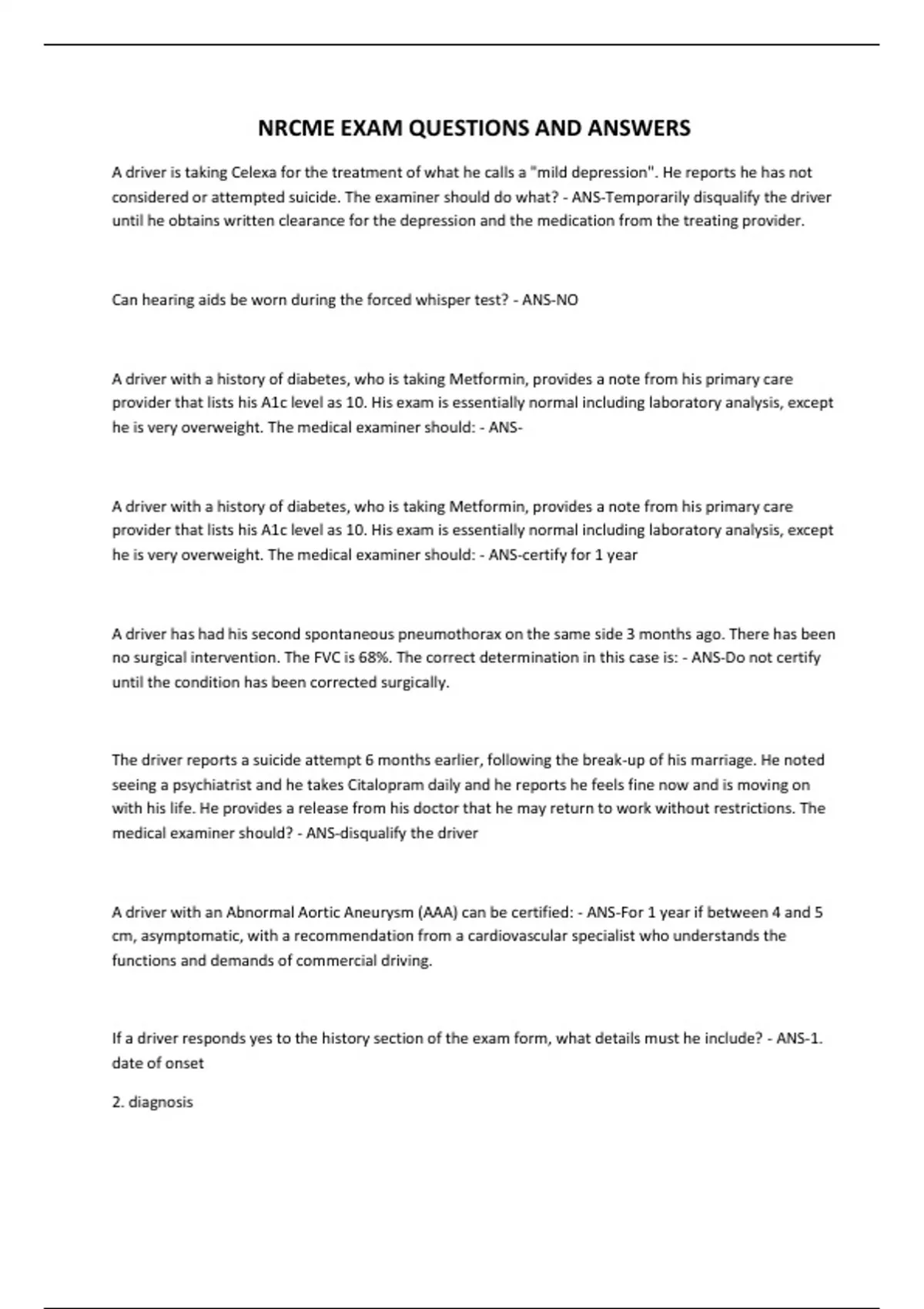 NRCME EXAM QUESTIONS AND ANSWERS A driver is taking Celexa for the treatment of what he calls a "mild depression". He reports he has not considered or attempted suicide. The examiner should do what? - ANS-Temporarily disqualify the driver until he obtains written clearance for the depression and the medication from the treating provider. Can hearing aids be worn during the forced whisper test? - ANS-NO A driver with a history of diabetes, who is taking Metformin, provides a note from his primary care provider that lists his A1c level as 10. His exam is essentially normal including laboratory analysis, except he is very overweight. The medical examiner should: - ANSA driver with a history of diabetes, who is taking Metformin, provides a note from his primary care provider that lists his A1c level as 10. His exam is essentially normal including laboratory analysis, except he is very overweight. The medical examiner should: - ANS-certify for 1 year A driver has had his second spontaneous pneumothorax on the same side 3 months ago. There has been no surgical intervention. The FVC is 68%. The correct determination in this case is: - ANS-Do not certify until the condition has been corrected surgically. The driver reports a suicide attempt 6 months earlier, following the break-up of his marriage. He noted seeing a psychiatrist and he takes Citalopram daily and he reports he feels fine now and is moving on with his life. He provides a release from his doctor that he may return to work without restrictions. The medical examiner should? - ANS-disqualify the driver A driver with an Abnormal Aortic Aneurysm (AAA) can be certified: - ANS-For 1 year if between 4 and 5 cm, asymptomatic, with a recommendation from a cardiovascular specialist who understands the functions and demands of commercial driving. If a driver responds yes to the history section of the exam form, what details must he include? - ANS...