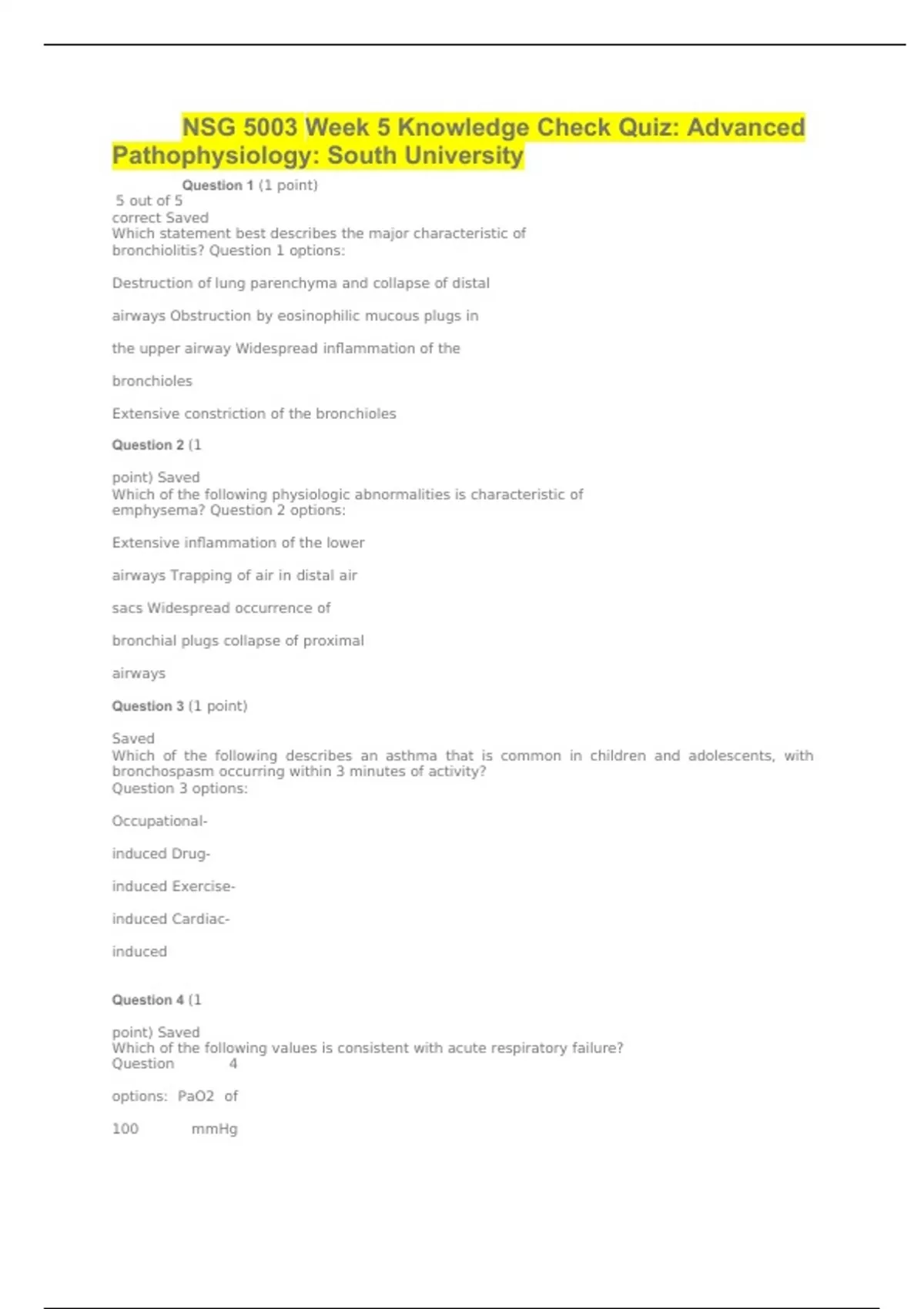 NSG 5003 Week 5 Knowledge Check Quiz: Advanced Pathophysiology: South University Question 1 (1 point) 5 out of 5 correct Saved Which statement best describes the major characteristic of bronchiolitis? Question 1 options: Destruction of lung parenchyma and collapse of distal airways Obstruction by eosinophilic mucous plugs in the upper airway Widespread inflammation of the bronchioles Extensive constriction of the bronchioles Question 2 (1 point) Saved Which of the following physiologic abnormalities is characteristic of emphysema? Question 2 options: Extensive inflammation of the lower airways Trapping of air in distal air sacs Widespread occurrence of bronchial plugs collapse of proximal airways Question 3 (1 point) Saved Which of the following describes an asthma that is common in children and adolescents, with bronchospasm occurring within 3 minutes of activity? Question 3 options: Occupational-induced Drug-induced Exercise-induced Cardiac-induced Question 4 (1 point) Saved Which of the following values is consistent with acute respiratory failure? Question 4 options: PaO2 of 100 mmHg PaCO2 of 40 mmHg pH less than 7.3 pH greater than 7.6 Question 5 (1 point) Saved