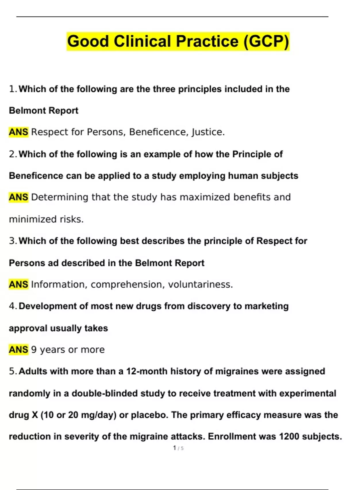 Good Clinical Practice (GCP) 2024 Questions with 100% Correct Answers | Verified | Latest Update.1. Which of the following are the three principles included in the Belmont Report ANS Respect for Persons, Beneficence, Justice. 2. Which of the following is an example of how the Principle of Beneficence can be applied to a study employing human subjects ANS Determining that the study has maximized benefits and minimized risks. 3. Which of the following best describes the principle of Respect for Persons ad described in the Belmont Report ANS Information, comprehension, voluntariness. 4. Development of most new drugs from discovery to marketing approval usually takes ANS 9 years or more 5. Adults with more than a 12-month history of migraines were assigned randomly in a double-blinded study to receive treatment with experimental drug X (10 or 20 mg/day) or placebo. The primary efficacy measure was the reduction in severity of the migraine attacks. Enrollment was 1200 subjects. Which of the following best describes the clinical phase of this study ANS Phase III 6. Long-term toxicology of an experimental drug in animals most likely refers to which part of drug development ANS Preclinical 7. Pharmacokinetics and pharmacodynamics of a new formulation of an in- vestigational drug most likely refers to which clinical phase of a study in humans ANS Phase I