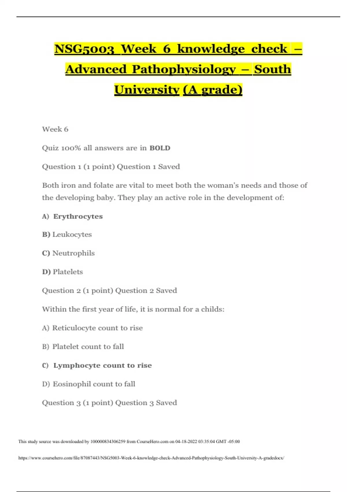 NSG5003 Week 6 knowledge check – Advanced Pathophysiology – South University (A grade) Week 6 Quiz 100% all answers are in BOLD Question 1 (1 point) Question 1 Saved Both iron and folate are vital to meet both the woman’s needs and those of the developing baby. They play an active role in the development of: A) Erythrocytes B) Leukocytes C) Neutrophils D) Platelets Question 2 (1 point) Question 2 Saved Within the first year of life, it is normal for a childs: A) Reticulocyte count to rise B) Platelet count to fall C) Lymphocyte count to rise D) Eosinophil count to fall Question 3 (1 point) Question 3 Saved A 63-year-old woman with diabetes notes that she has a general feeling of tiredness and a loss of appetite. The physician collects a CBC in addition to normal diabetic laboratory tests. The results indicate an anemia, and she is referred to a hematologist. The hematologist reviews her laboratory findings and begins to explain her diagnosis of megaloblastic anemia. Further testing indicates that the woman suffers from a vitamin B12 deficiency or PA. This condition is often associated with: A) Chronic gastritis B) Thalassemia C) Thalassemia D) Inadequate dietary intake Question 4 (1 point) Question 4 Saved The treatment for iron overload is A) Vitamin C supplements B) Phlebotomy C) Aspirin D) Plasmapheresis Question 5 (1 point) Question 5 Unsaved DIC is secondary to a wide variety of well-defined clinical conditions, specifically those that activate the clotting cascade. The clotting may result in the consumption of platelets, and clotting factors may lead to severe bleeding that is caused by: