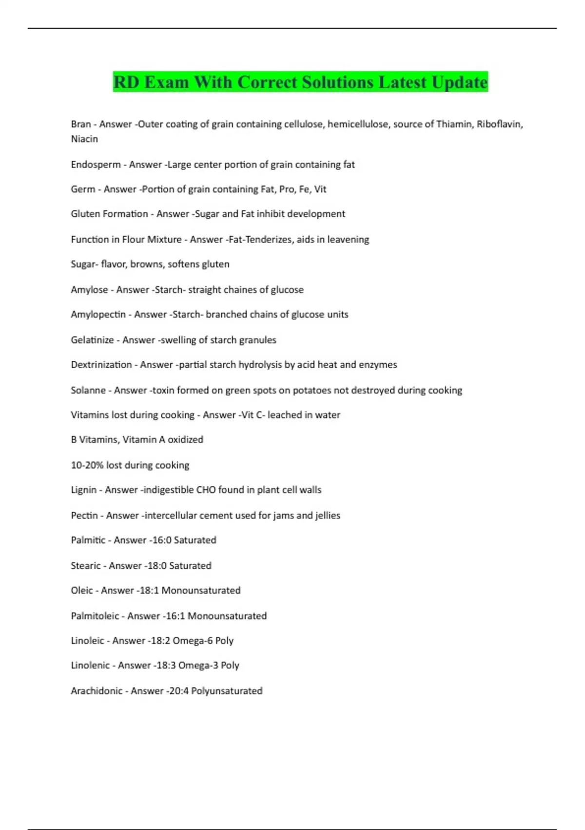 RD Exam With Correct Solutions Latest Update Bran - Answer -Outer coating of grain containing cellulose, hemicellulose, source of Thiamin, Riboflavin, Niacin Endosperm - Answer -Large center portion of grain containing fat Germ - Answer -Portion of grain containing Fat, Pro, Fe, Vit Gluten Formation - Answer -Sugar and Fat inhibit development Function in Flour Mixture - Answer -Fat-Tenderizes, aids in leavening Sugar- flavor, browns, softens gluten Amylose - Answer -Starch- straight chaines of glucose Amylopectin - Answer -Starch- branched chains of glucose units Gelatinize - Answer -swelling of starch granules Dextrinization - Answer -partial starch hydrolysis by acid heat and enzymes Solanne - Answer -toxin formed on green spots on potatoes not destroyed during cooking Vitamins lost during cooking - Answer -Vit C- leached in water B Vitamins, Vitamin A oxidized 10-20% lost during cooking Lignin - Answer -indigestible CHO found in plant cell walls Pectin - Answer -intercellular cement used for jams and jellies Palmitic - Answer -16:0 Saturated Stearic - Answer -18:0 Saturated Oleic - Answer -18:1 Monounsaturated Palmitoleic - Answer -16:1 Monounsaturated Linoleic - Answer -18:2 Omega-6 Poly Linolenic - Answer -18:3 Omega-3 Poly Arachidonic - Answer -20:4 Polyunsaturated