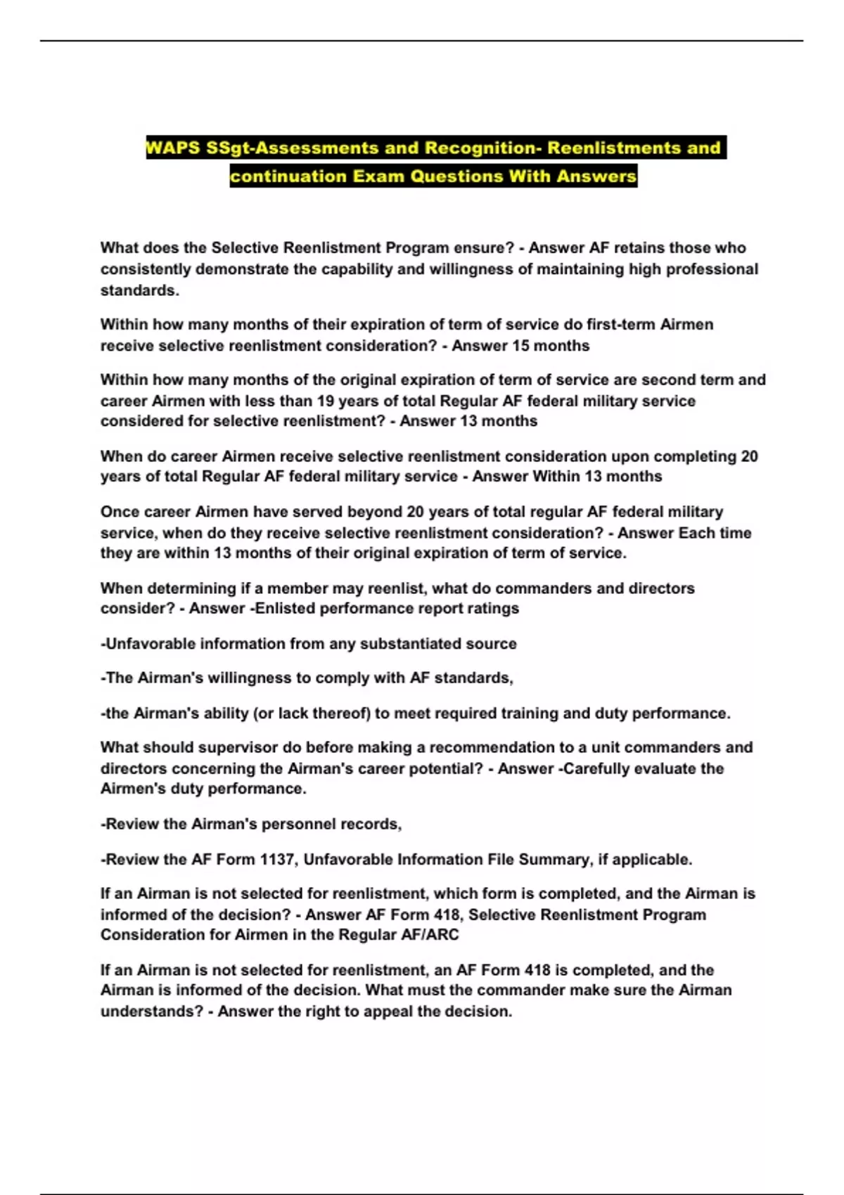 WAPS SSgt-Assessments and Recognition- Reenlistments and continuation Exam Questions With Answers...