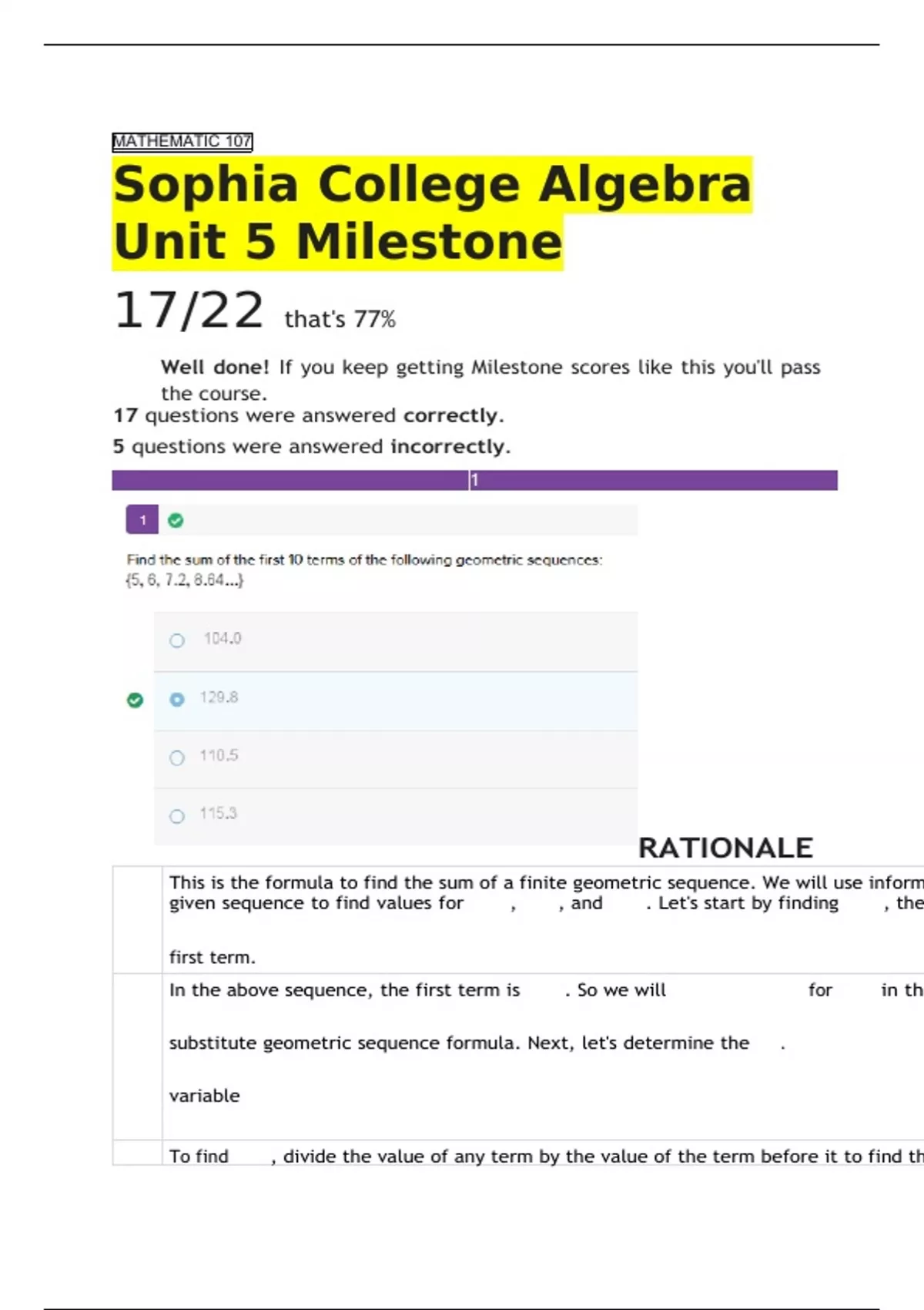 MATHEMATIC 107 Sophia College Algebra Unit 5 Milestone 17/22 that's 77% Well done! If you keep getting Milestone scores like this you'll pass the course. 17 questions were answered correctly. 5 questions were answered incorrectly. 1 RATIONALE CONCEPT Sum of a Finite Geometric Sequence 2 RATIONALE