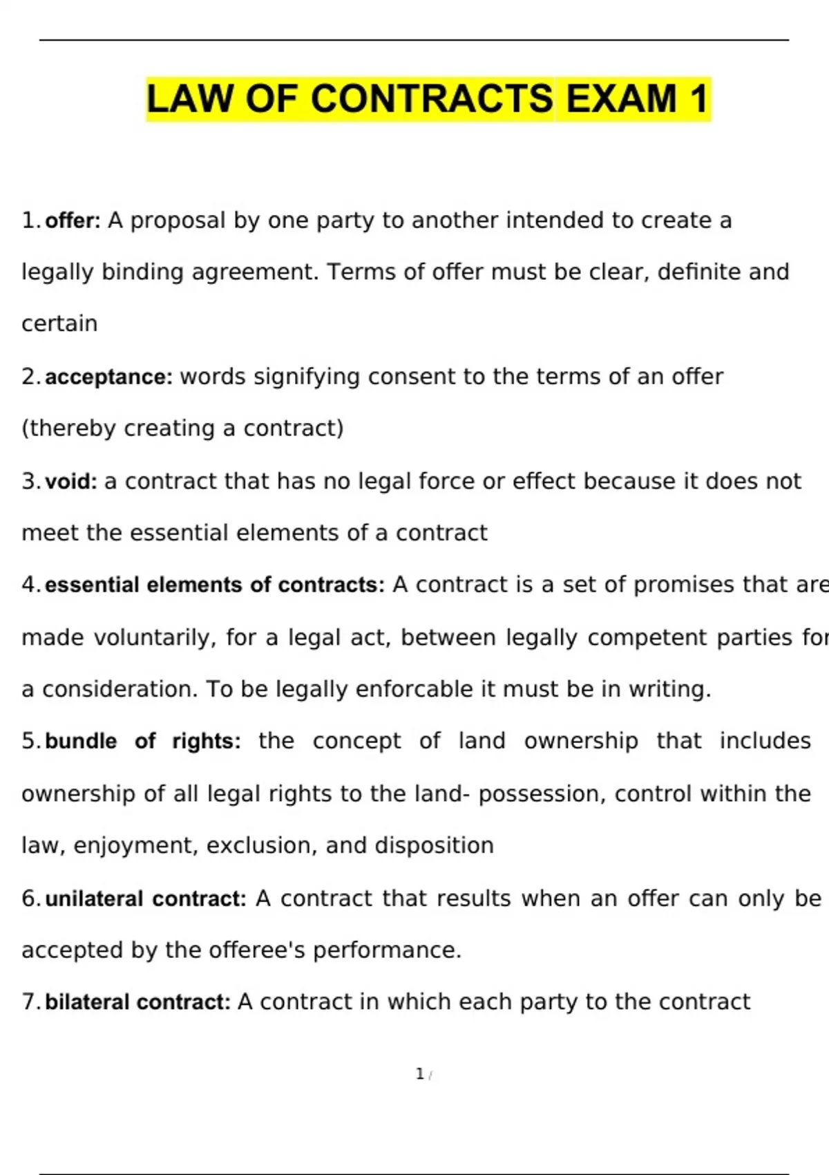 1. offer: A proposal by one party to another intended to create a legally binding agreement. Terms of offer must be clear, definite and certain 2. acceptance: words signifying consent to the terms of an offer (thereby creating a contract) 3. void: a contract that has no legal force or effect because it does not meet the essential elements of a contract 4. essential elements of contracts: A contract is a set of promises that are made voluntarily, for a legal act, between legally competent parties for a consideration. To be legally enforcable it must be in writing. 5. bundle of rights: the concept of land ownership that includes ownership of all legal rights to the land- possession, control within the law, enjoyment, exclusion, and disposition 6. unilateral contract: A contract that results when an offer can only be accepted by the offeree's performance. 7. bilateral contract: A contract in which each party to the contract promises to perform some act or duty in exchange for the promise of the other party. 8. assignments: the transfer in writing of interest in a bond, mortgage, lease, or other instrument 9. delegation: a task or piece of work assigned to someone 10. legal value: Legal proof of authority or business transaction, enforceable rights or obligations, or the basis for a legal action 11. counteroffer: a new offer made in response to an offer received 12. novation: the replacement of one obligation by another by mutual agreement of both parties