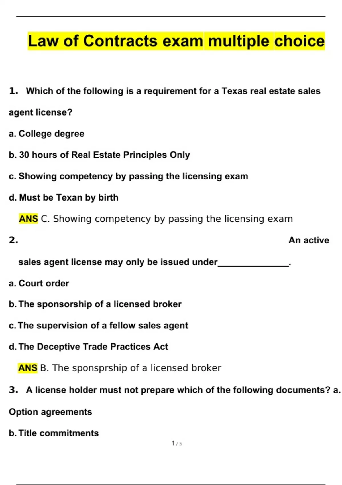 1. Which of the following is a requirement for a Texas real estate sales agent license? a. College degree b. 30 hours of Real Estate Principles Only c. Showing competency by passing the licensing exam d. Must be Texan by birth ANS C. Showing competency by passing the licensing exam 2. An active sales agent license may only be issued under . a. Court order b. The sponsorship of a licensed broker c. The supervision of a fellow sales agent d. The Deceptive Trade Practices Act ANS B. The sponsprship of a licensed broker 3. A license holder must not prepare which of the following documents? a. Option agreements b. Title commitments c. Wills d. A license holder must not prepare any of these documents ANS D. a license holder must not prepare any of these documents 4. Todd planted two live oaks and four magnolia trees on his 3-acre property. These trees are examples of . a. Improvements b. Emblements c. Fixtures d. Personal property ANS A. Improvements