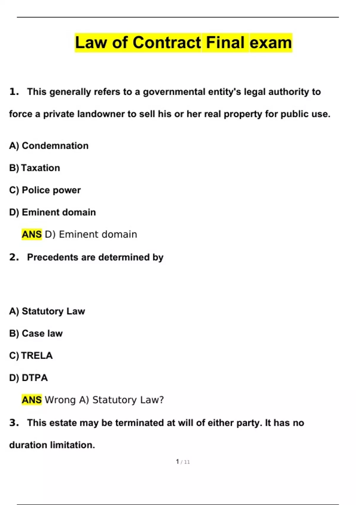 1. This generally refers to a governmental entity's legal authority to force a private landowner to sell his or her real property for public use. A) Condemnation B) Taxation C) Police power D) Eminent domain ANS D) Eminent domain 2. Precedents are determined by A) Statutory Law B) Case law C) TRELA D) DTPA ANS Wrong A) Statutory Law? 3. This estate may be terminated at will of either party. It has no duration limitation. A) Estate at will B) Estate from period to period C) Estate for years D) Freehold estate ANS A) Estate at will? 4. A form of shared property ownership in which rights vest in several owners for a specified period each year. A) Cooperatives B) Time shares C) Townhomes Condominiums ANS B) Time shares