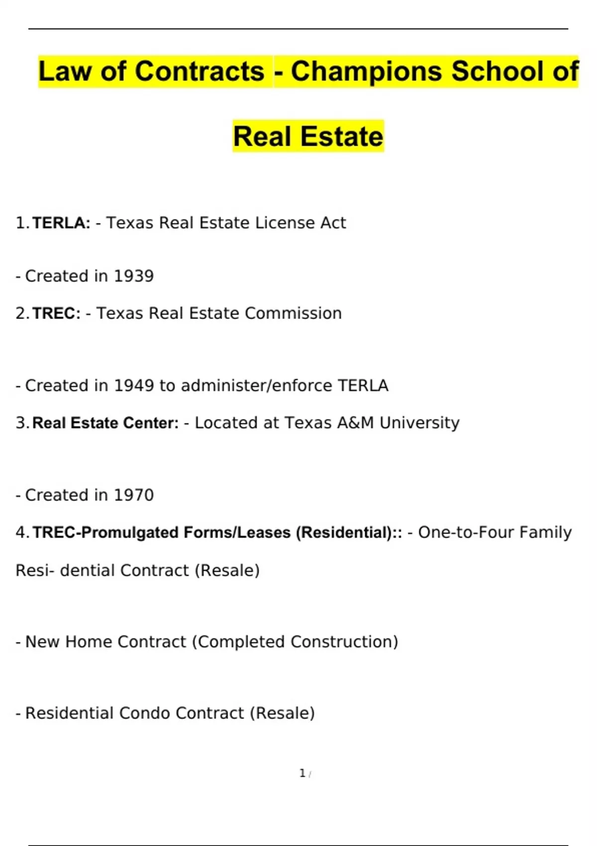 1. TERLA: - Texas Real Estate License Act - Created in 1939 2. TREC: - Texas Real Estate Commission - Created in 1949 to administer/enforce TERLA 3. Real Estate Center: - Located at Texas A&M University - Created in 1970 4. TREC-Promulgated Forms/Leases (Residential):: - One-to-Four Family Resi- dential Contract (Resale) - New Home Contract (Completed Construction) - Residential Condo Contract (Resale) - New Home Contract (Incomplete Construction) - Unimproved Property Contract - Farm and Ranch (Note: TREC has promulgated contract addenda and other forms, listed on Thepage 18) 5. Four categories of unlawful trade practices are:: 1 - Misleading or deceptive conduct employed by any person that was relied upon by the consumer to the consumer's detriment 2 - Breach of express or implied warranties 3 - Violation of the Texas Insurance Code (Chpt 51) - An unconscionable action or course of action by any person