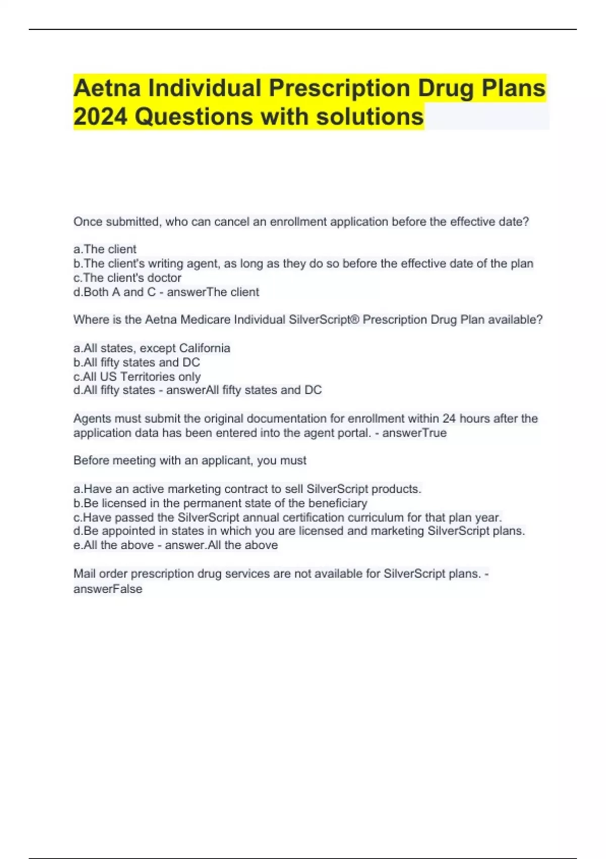 Aetna Individual Prescription Drug Plans 2024 Questions with solutions