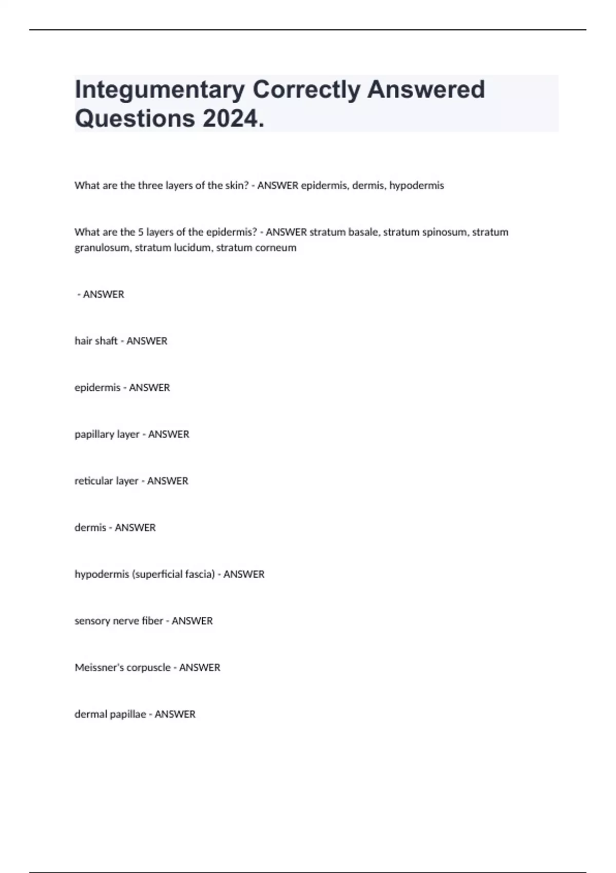 Integumentary Complete Test Correctly Answered Questions 2024. What are the three layers of the skin? - ANSWER epidermis, dermis, hypodermis What are the 5 layers of the epidermis? - ANSWER stratum basale, stratum spinosum, stratum granulosum, stratum lucidum, stratum corneum - ANSWER hair shaft - ANSWER epidermis - ANSWER papillary layer - ANSWER reticular layer - ANSWER dermis - ANSWER hypodermis (superficial fascia) - ANSWER sensory nerve fiber - ANSWER Meissner's corpuscle - ANSWER dermal papillae - ANSWER