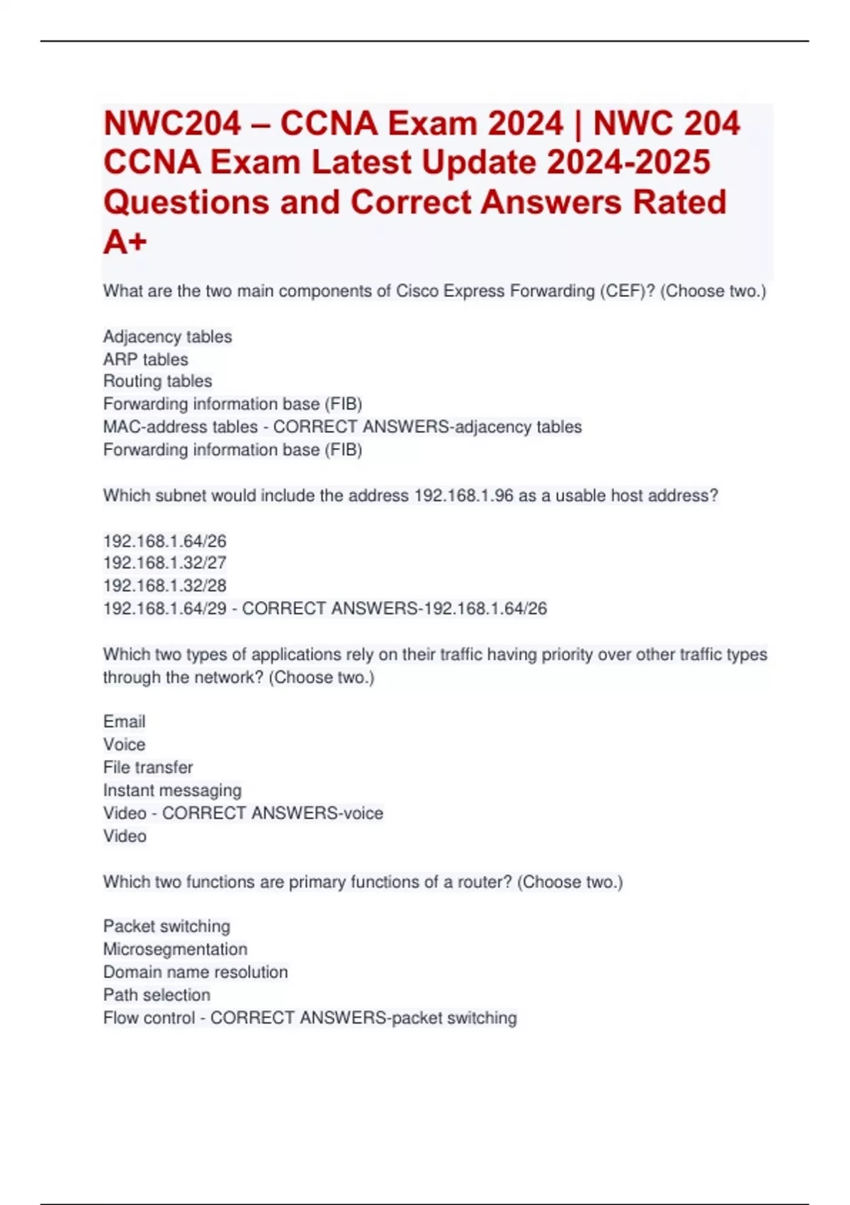 NWC204 – CCNA Exam 2024 | NWC 204 CCNA Exam Latest Update Questions and Correct Answers Rated A+