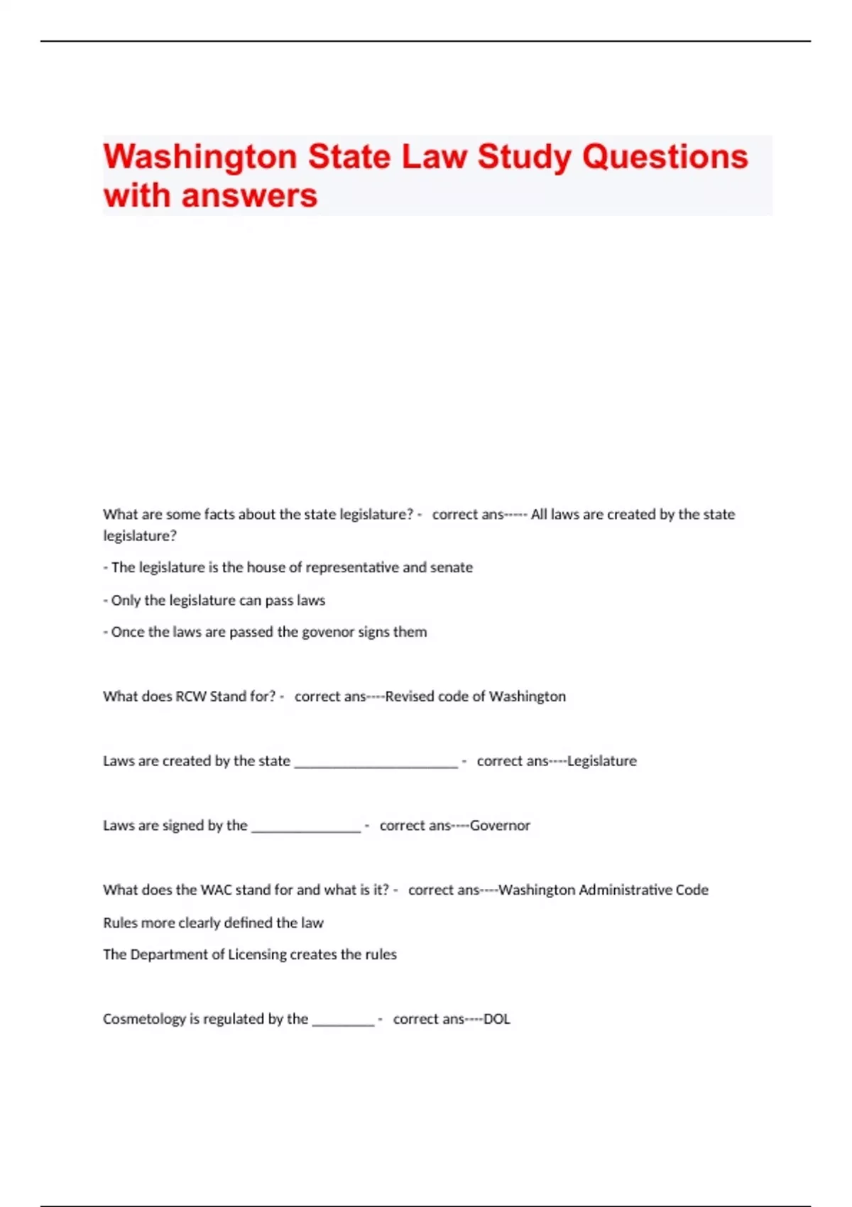 What are some facts about the state legislature? - correct ans----- All laws are created by the state legislature? - The legislature is the house of representative and senate - Only the legislature can pass laws - Once the laws are passed the govenor signs them What does RCW Stand for? - correct ans----Revised code of Washington Laws are created by the state _____________________ - correct ans----Legislature Laws are signed by the ______________ - correct ans----Governor What does the WAC stand for and what is it? - correct ans----Washington Administrative Code Rules more clearly defined the law The Department of Licensing creates the rules Cosmetology is regulated by the ________ - correct ans----DOL