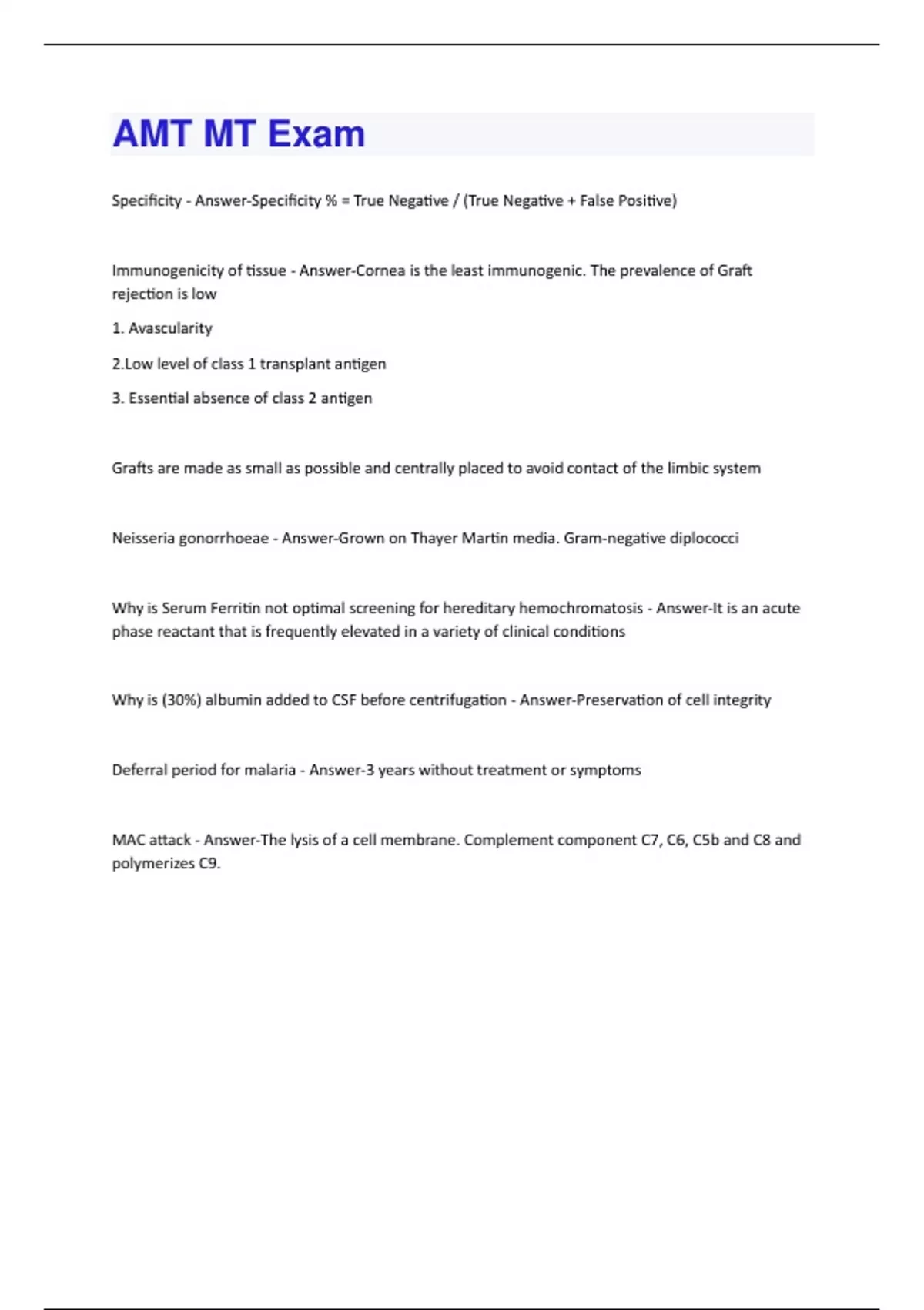 Specificity - Answer-Specificity % = True Negative / (True Negative + False Positive) Immunogenicity of tissue - Answer-Cornea is the least immunogenic. The prevalence of Graft rejection is low 1. Avascularity 2.Low level of class 1 transplant antigen 3. Essential absence of class 2 antigen Grafts are made as small as possible and centrally placed to avoid contact of the limbic system Neisseria gonorrhoeae - Answer-Grown on Thayer Martin media. Gram-negative diplococci Why is Serum Ferritin not optimal screening for hereditary hemochromatosis - Answer-It is an acute phase reactant that is frequently elevated in a variety of clinical conditions Why is (30%) albumin added to CSF before centrifugation - Answer-Preservation of cell integrity Deferral period for malaria - Answer-3 years without treatment or symptoms MAC attack - Answer-The lysis of a cell membrane. Complement component C7, C6, C5b and C8 and polymerizes C9.